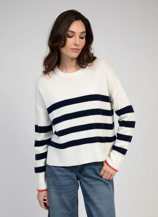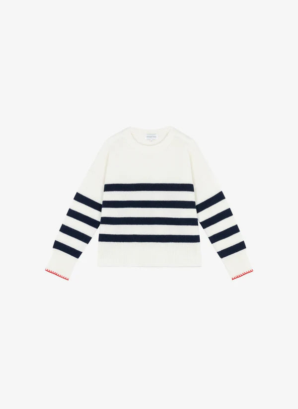 Stripes, but make them standout. This pullover knit is crafted from a luxurious wool and cashmere blend, pairing comfort with a touch of sophistication. The wide cream-and-navy stripes feel timeless, while the bold red blanket-stitch detailing adds an unexpected pop of fun. Finished with a classic round neckline, it’s the perfect piece for autumn days.