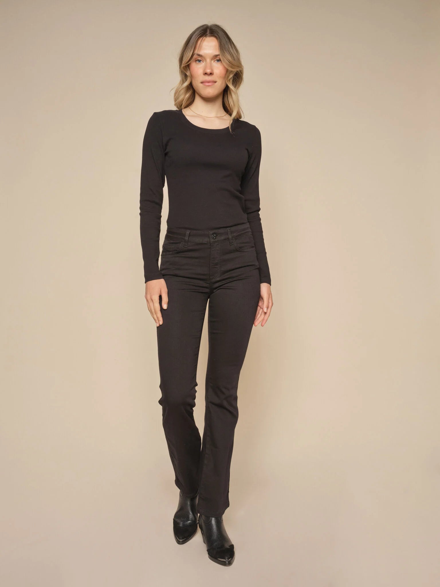 This classic flared fit jean feature a high rise waist, easy to style with blouses, jumpers and t-shirts all year round. In a deluxe, super soft finish, these jeans ensure comfort all day long, and their timeless black colour allows for versatility from day to night.