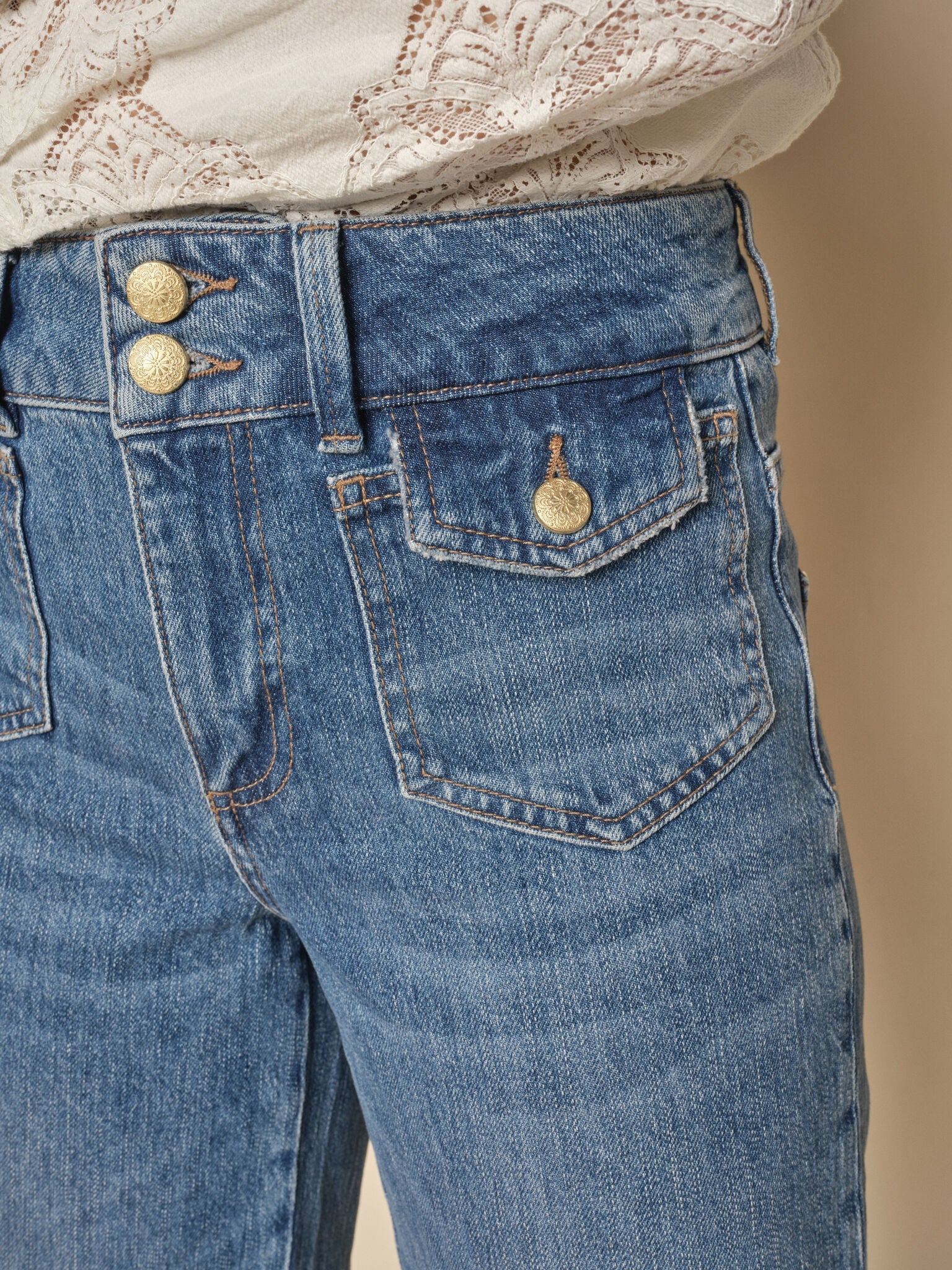 Inspired by the 1970s these iconic flared jeans will become your go-to for wide leg styles. With a high waistline and patch pockets with flap details, these jeans are a modern twist on vintage classics. The higher waistline makes styling these jeans simple, tuck in a t-shirt or knitted jumper and pair with your favourite jacket.