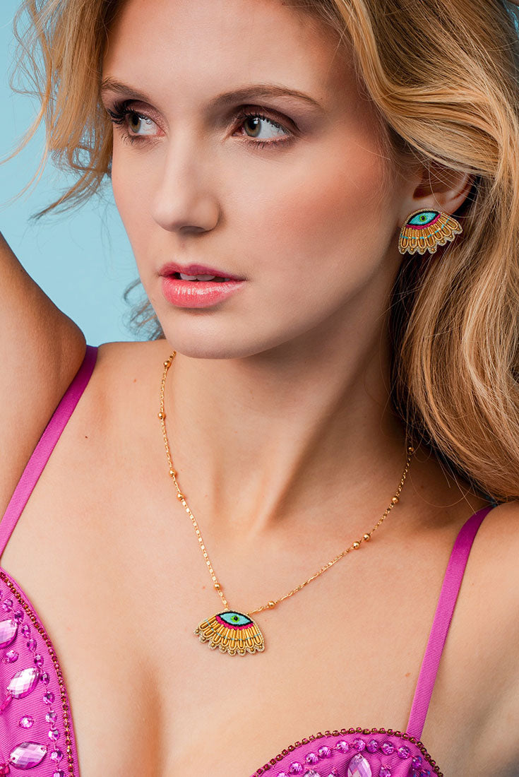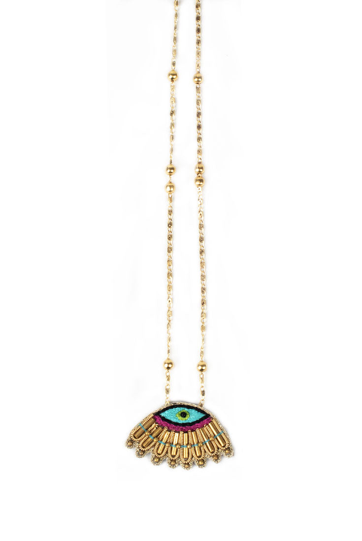This playful piece features a hand-embroidered eye charm, with metallic thread details. The glimmer of brass sequins are a real stand-out, perfect for dressing up a simple outfit.