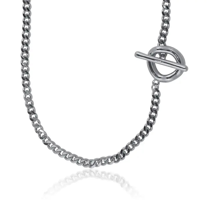 Turn heads with this chunky statement chain necklace, featuring bold links and a modern T-bar closure. Its oversized, edgy design makes it the perfect standout piece for layering over simple tops or adding instant flair to any outfit. Sleek, versatile, and undeniably contemporary, this necklace is a must-have for jewellery lovers who like to make a confident style statement.