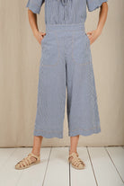 Loose + relaxed fitting, 3/4 length, wide leg pull on trouser in organic cotton seersucker gingham, with an elasticated back and a feminine scallop hem detail.