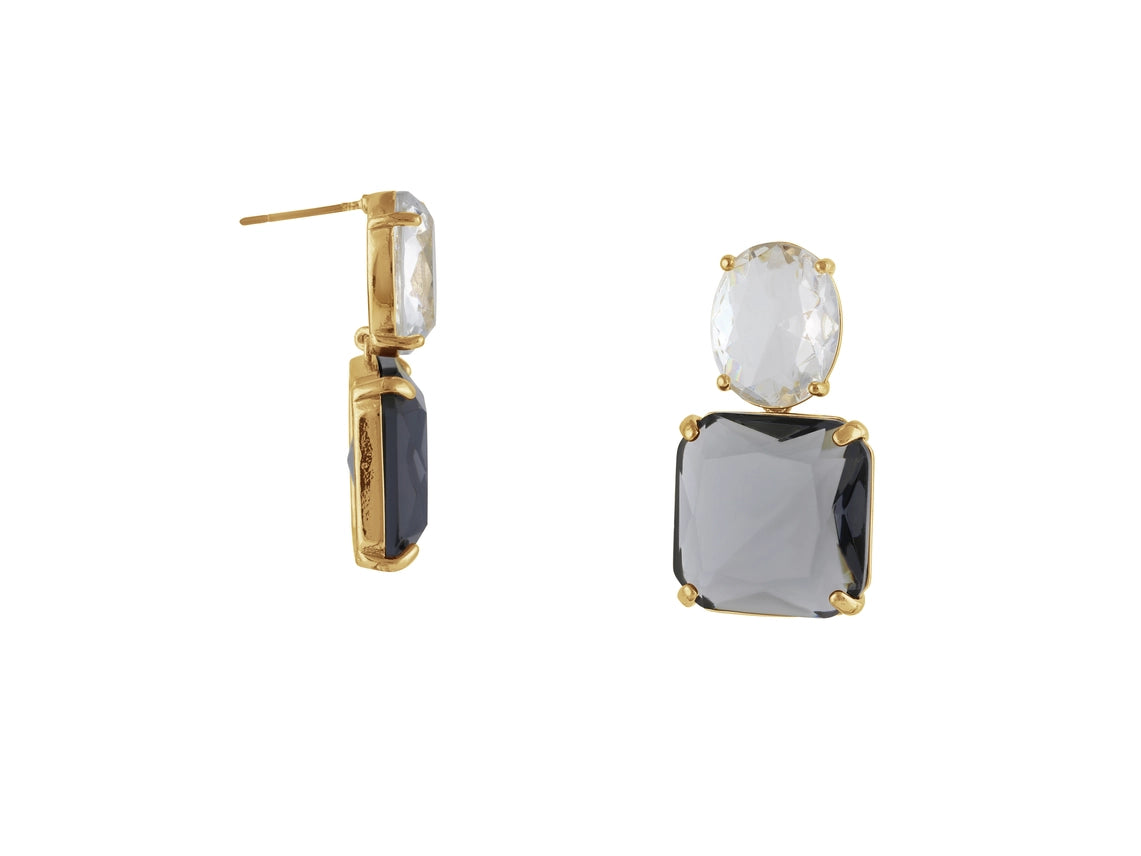 Delicate yet striking, these stud earrings feature hand-cut glass stones in teardrop and square shapes, set in gleaming gold-plated settings. Designed with a dangle effect for subtle movement, they catch the light beautifully from every angle. Finished with hypoallergenic surgical steel posts, they’re safe for sensitive ears while remaining effortlessly chic. Perfect for adding a refined touch to everyday looks or bringing a little sparkle to evening styling.