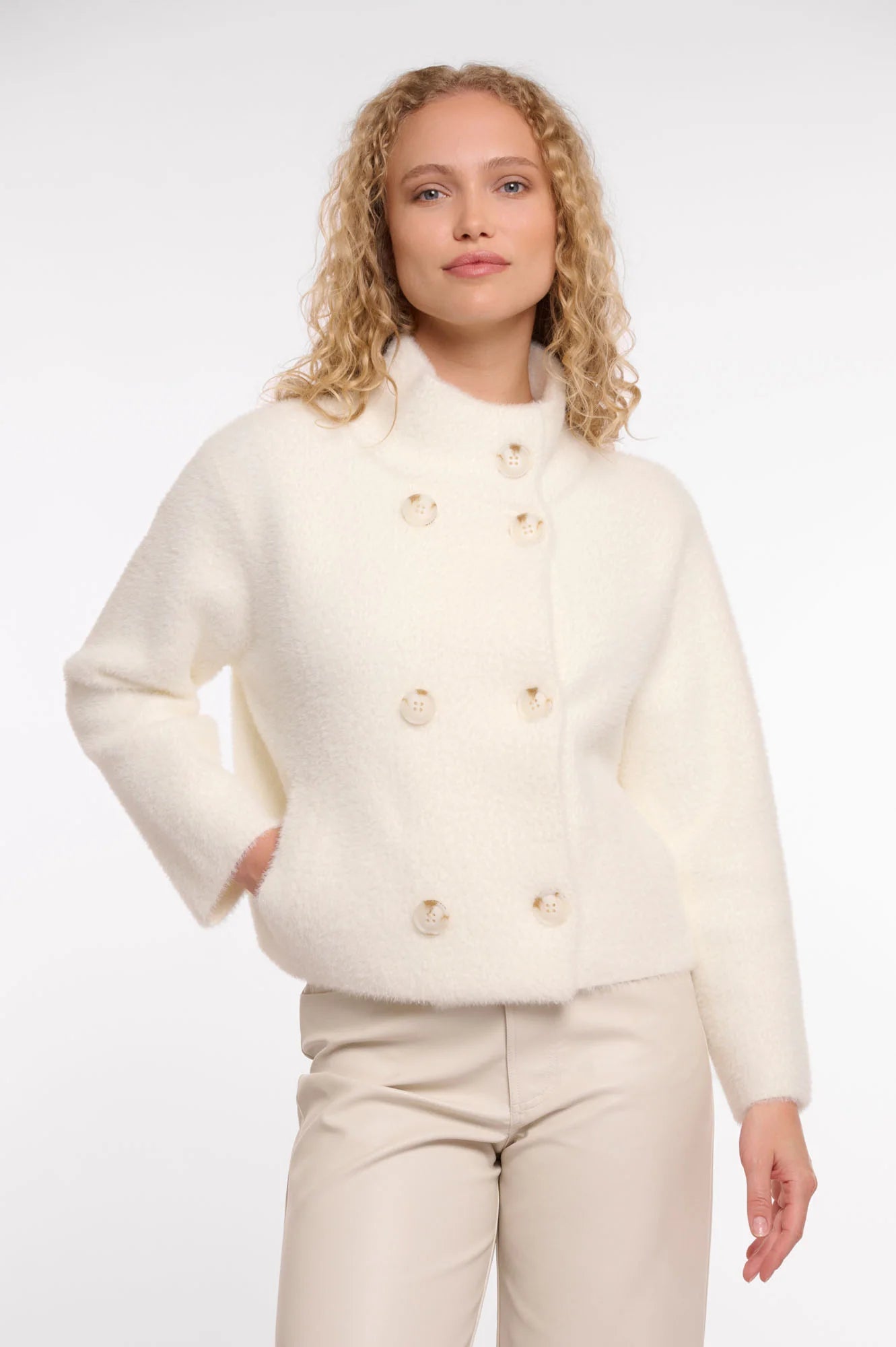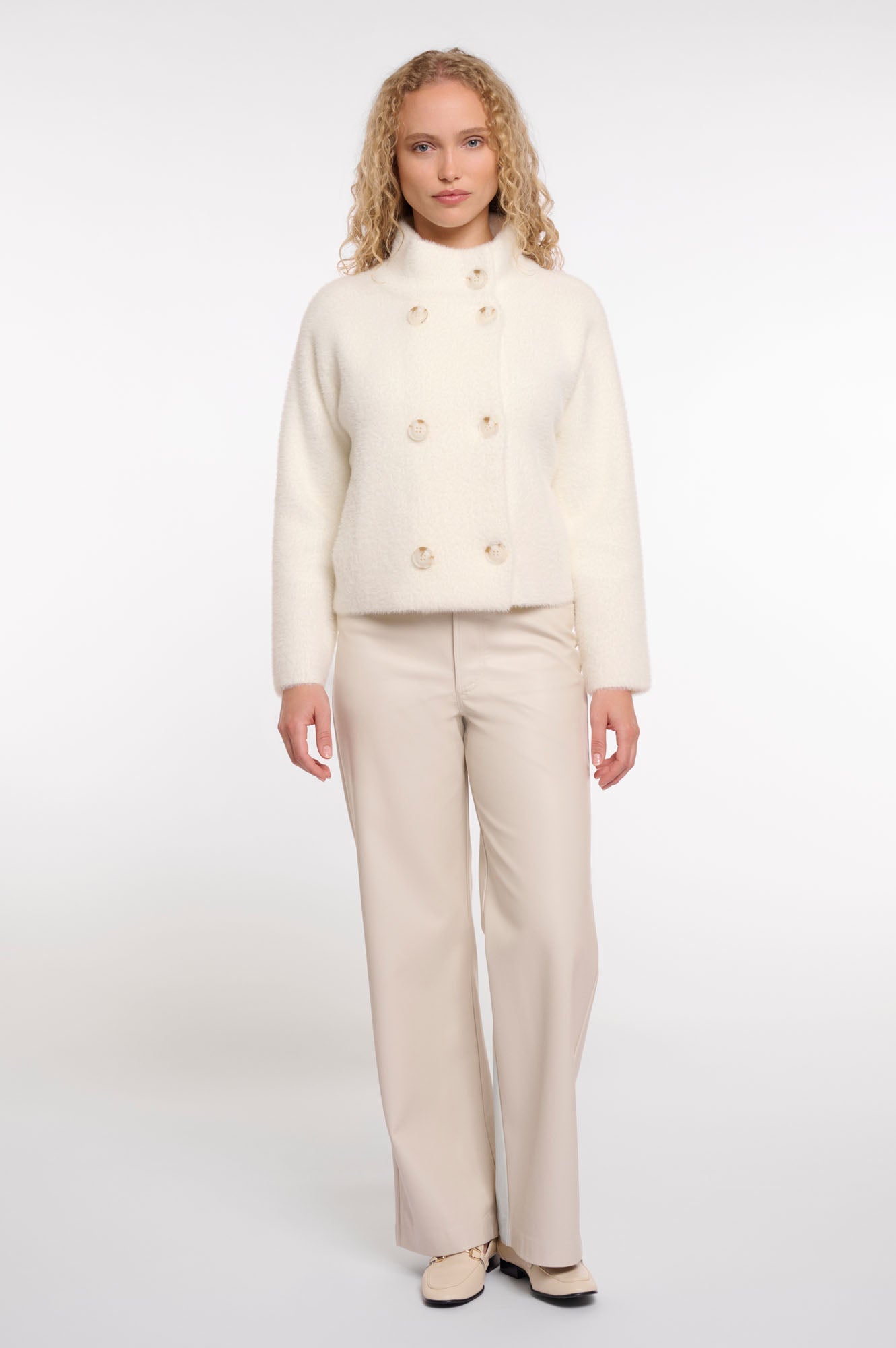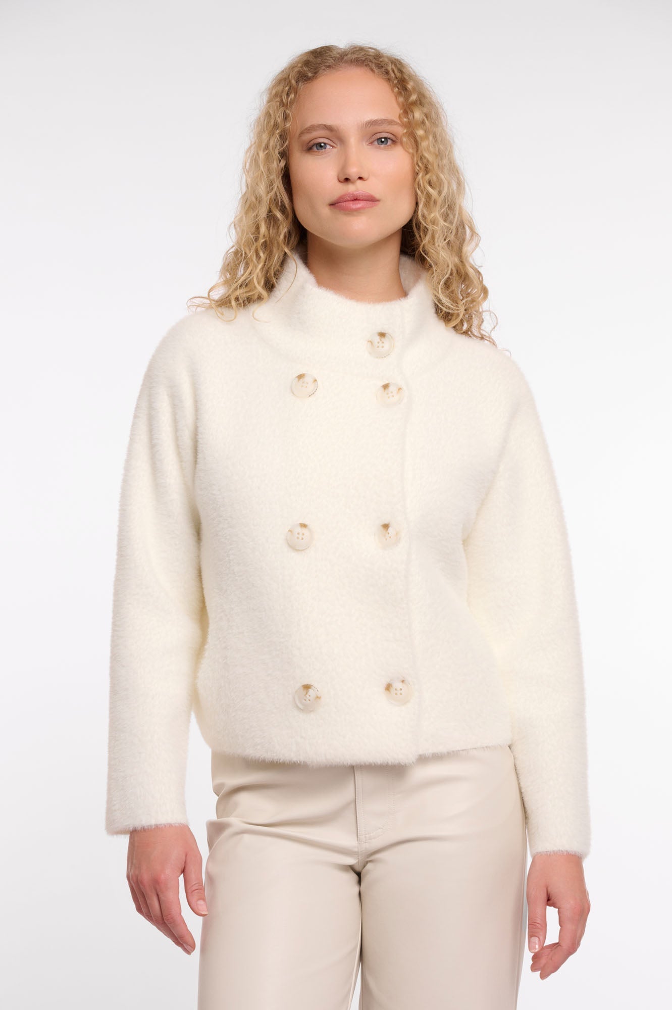 Short double-breasted cardigan made from our famous soft-woven knit. This cozy cardigan features a loose fit, a stand up collar, large buttons and slit pockets. Perfect to complement any look!