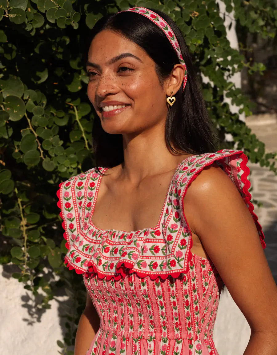 Bestselling Carrie dress is back for Spring ’26 in our striking Alpine Rose stripe. Screen-printed by hand, this vibrant design combines pretty shades of pink and red for a fresh, joyful look. A delicate border ruffle frames the neckline, while the softly smocked body creates a comfortable, flattering fit. We love the clever directional change of the stripe in the skirt — a subtle detail that makes this dress truly special. Effortlessly feminine and easy to wear, the Carrie dress is perfect for holidays, weddings and everything in between.