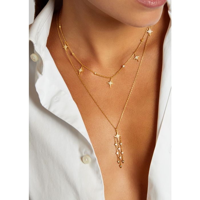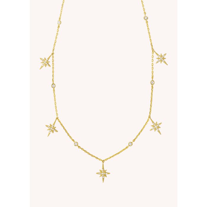 This beautiful chain necklace features a row of star charms on a dainty gold chain, we think this makes for the perfect layering piece.
