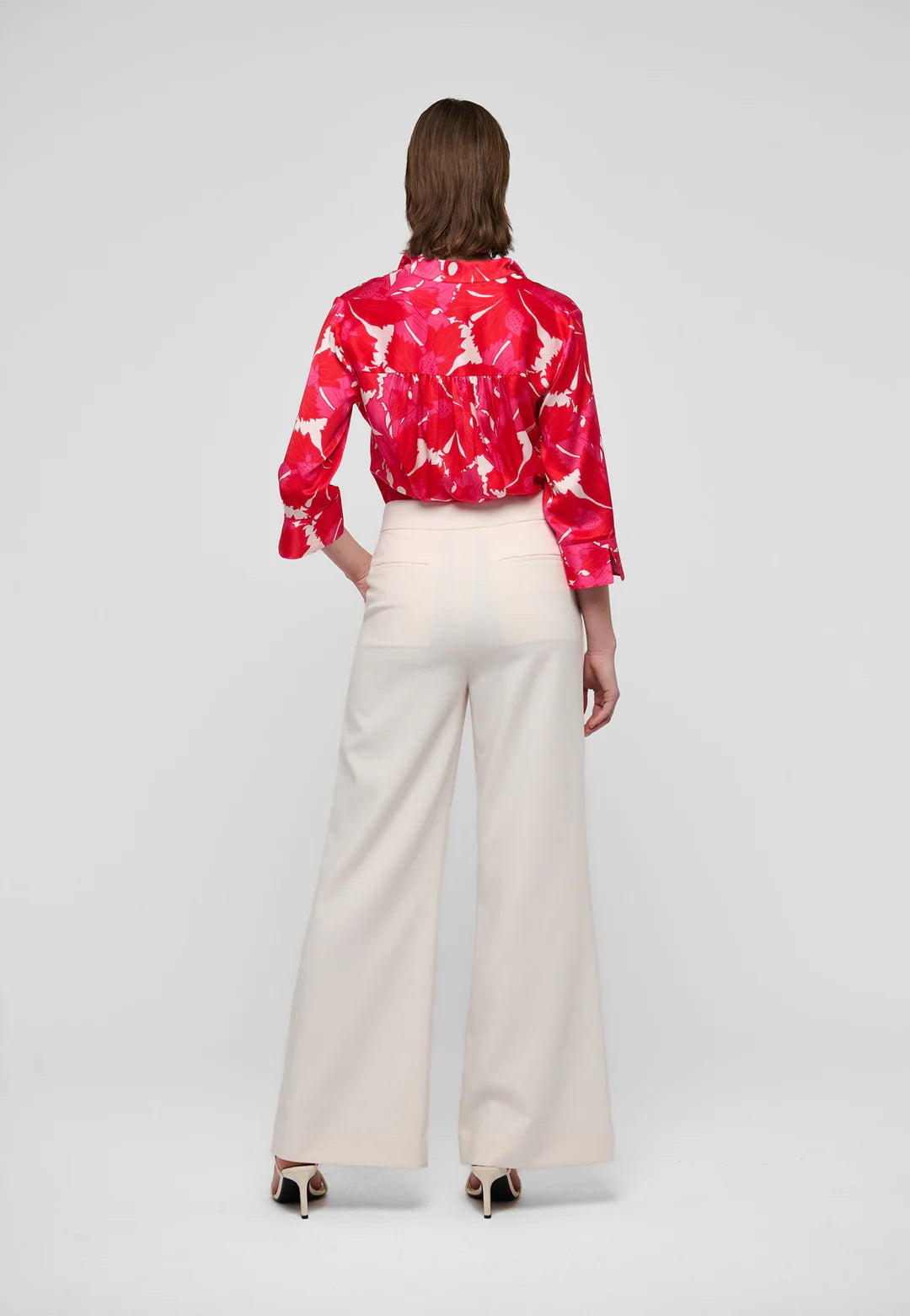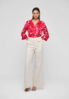 The minimalist details of this sophisticated regular fit silk blouse allow the bold graphic floral print in shades of red and pink to take all the attention. A stand collar leads down to a simple cross over placket whilst 3/4 length sleeves end with a deep cuff that echoes the style of a kimono.