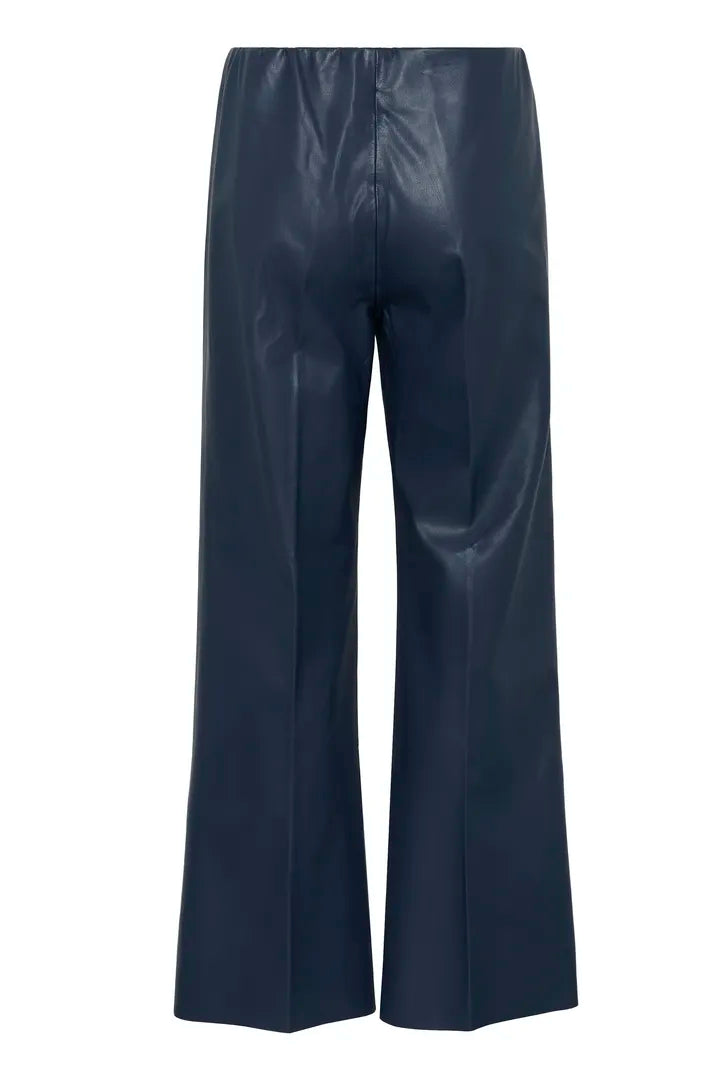Edgy meets effortless. These petrol blue faux leather trousers feature a flared fit and an elasticated waistband for comfort without compromising on style. The seamless design keeps the silhouette sleek and modern, making them a statement piece that’s easy to wear.