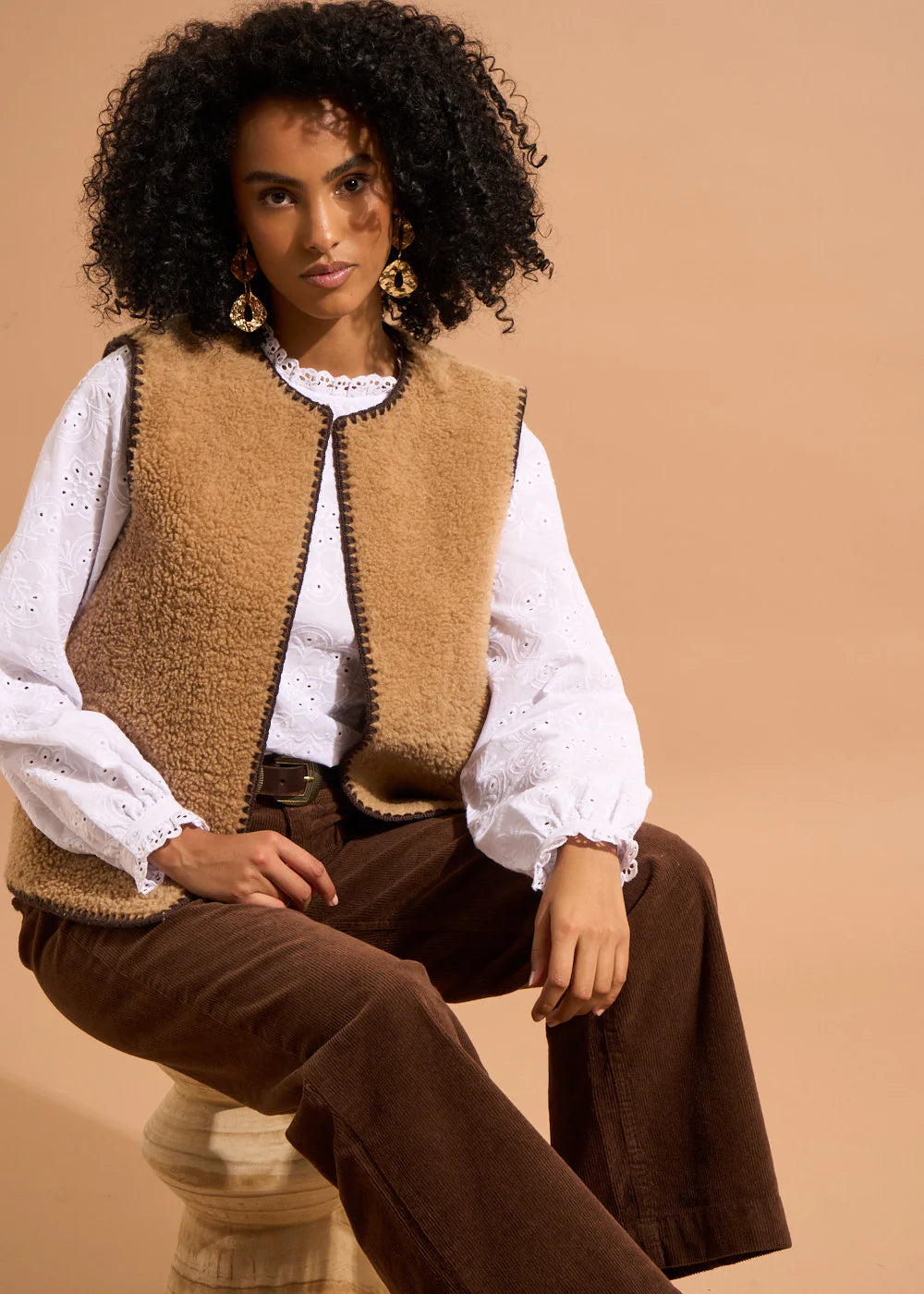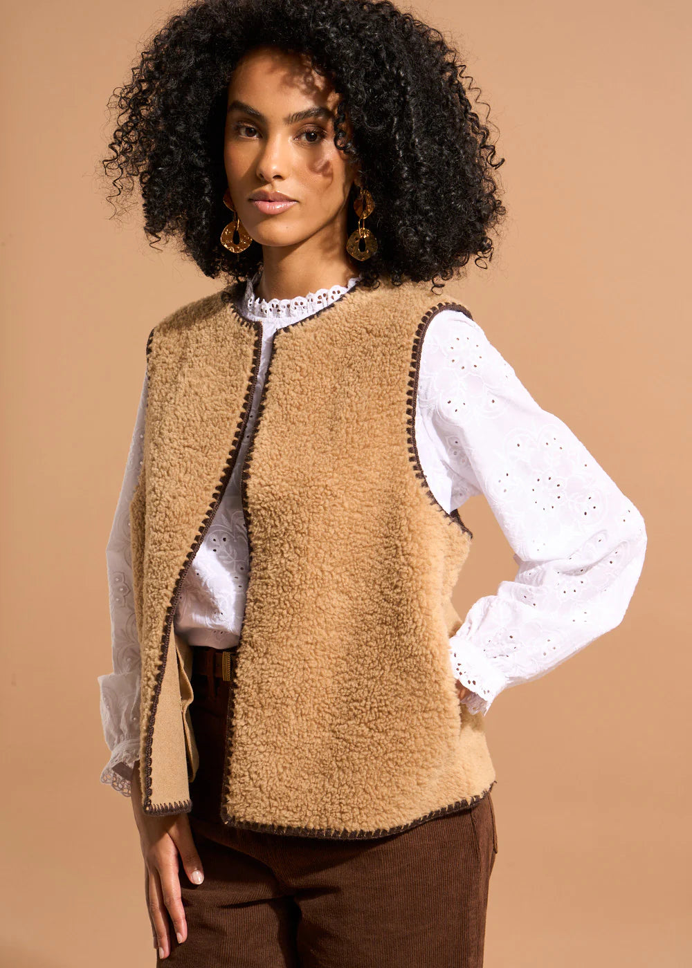 Add a touch of playful luxury with this faux fur vest in soft teddy-style fabric. Designed sleeveless for easy layering, it features a delicate rounded collar and intricate embroidery on the collar, front, and sleeves for a subtle, elegant flourish. Perfect for elevating casual outfits or adding a cosy, chic twist to your autumn and winter looks.