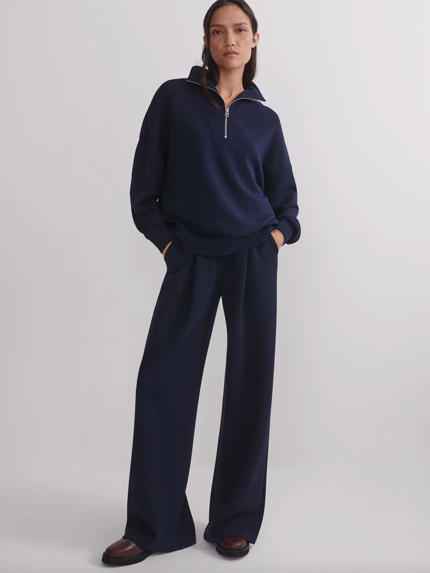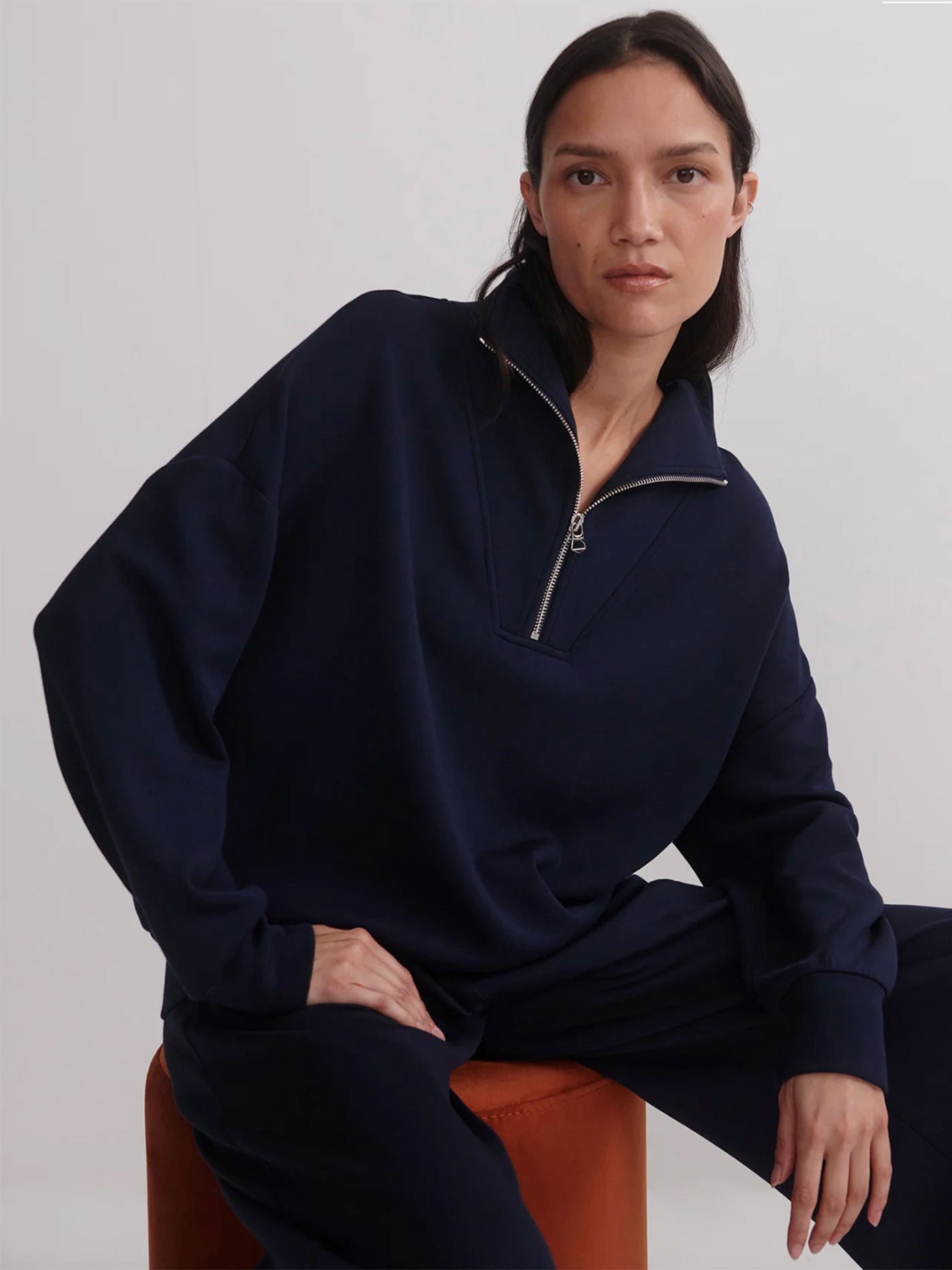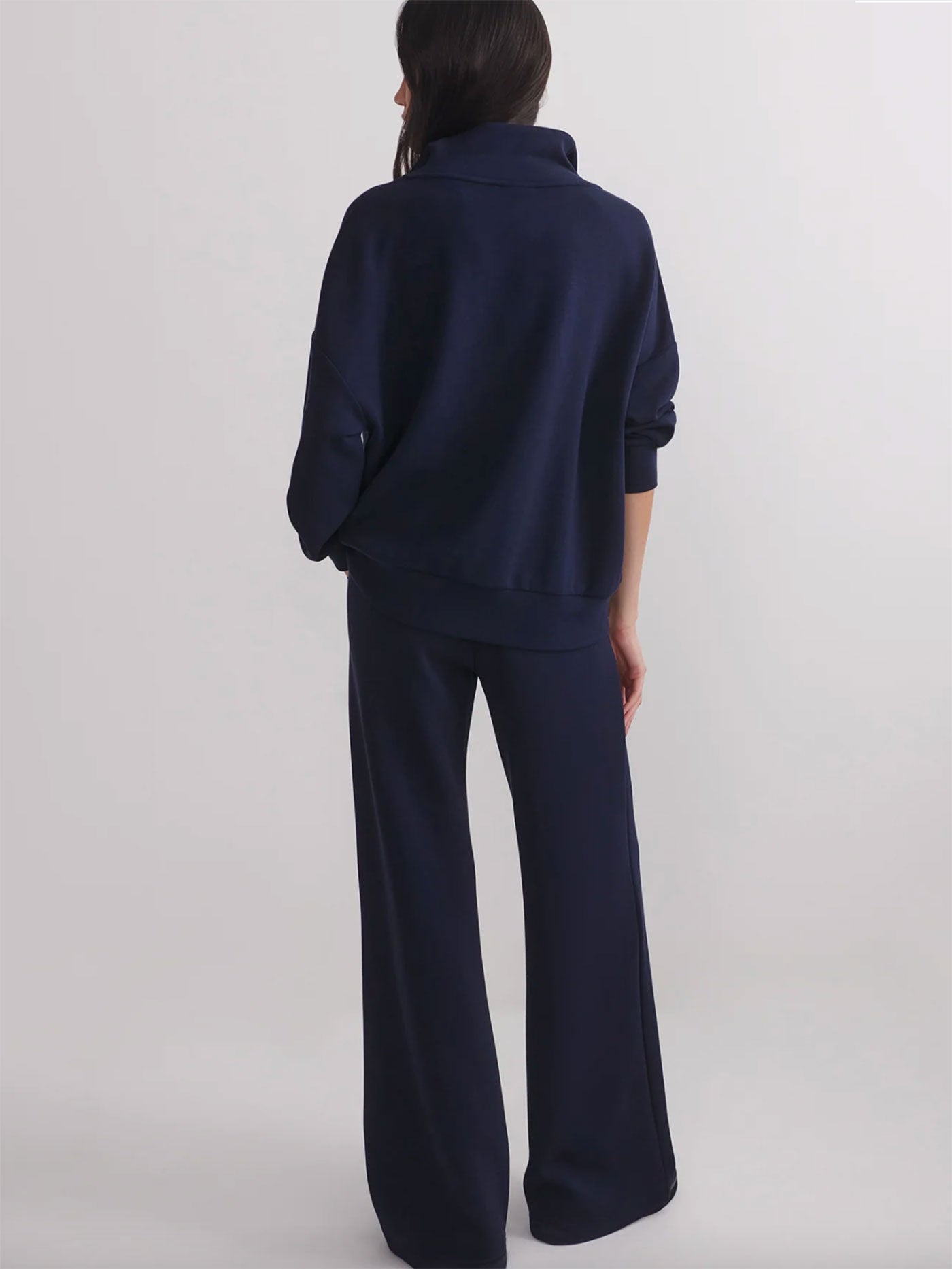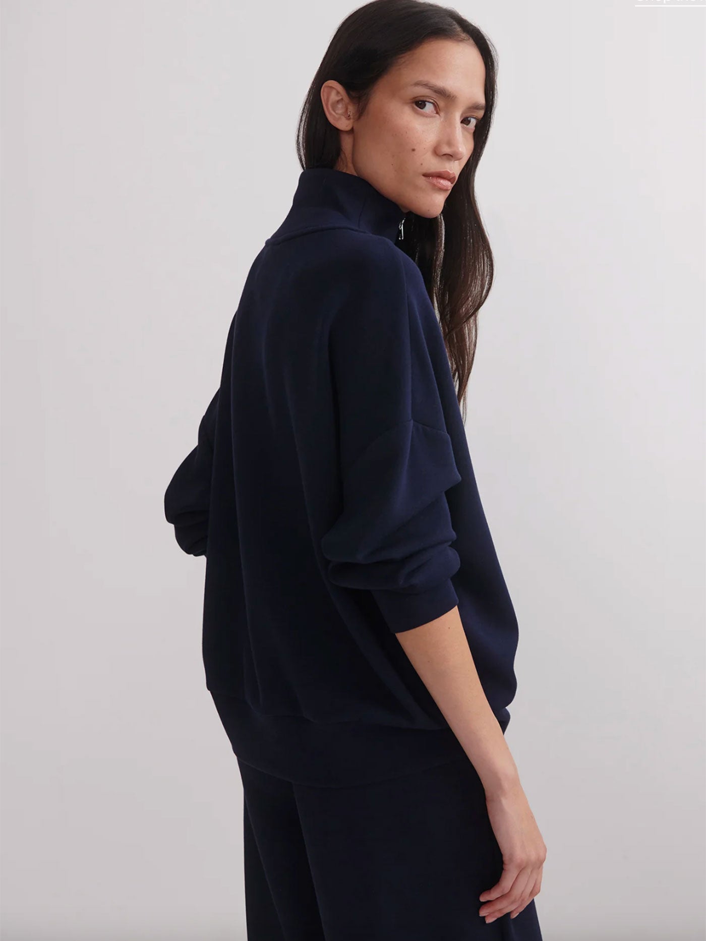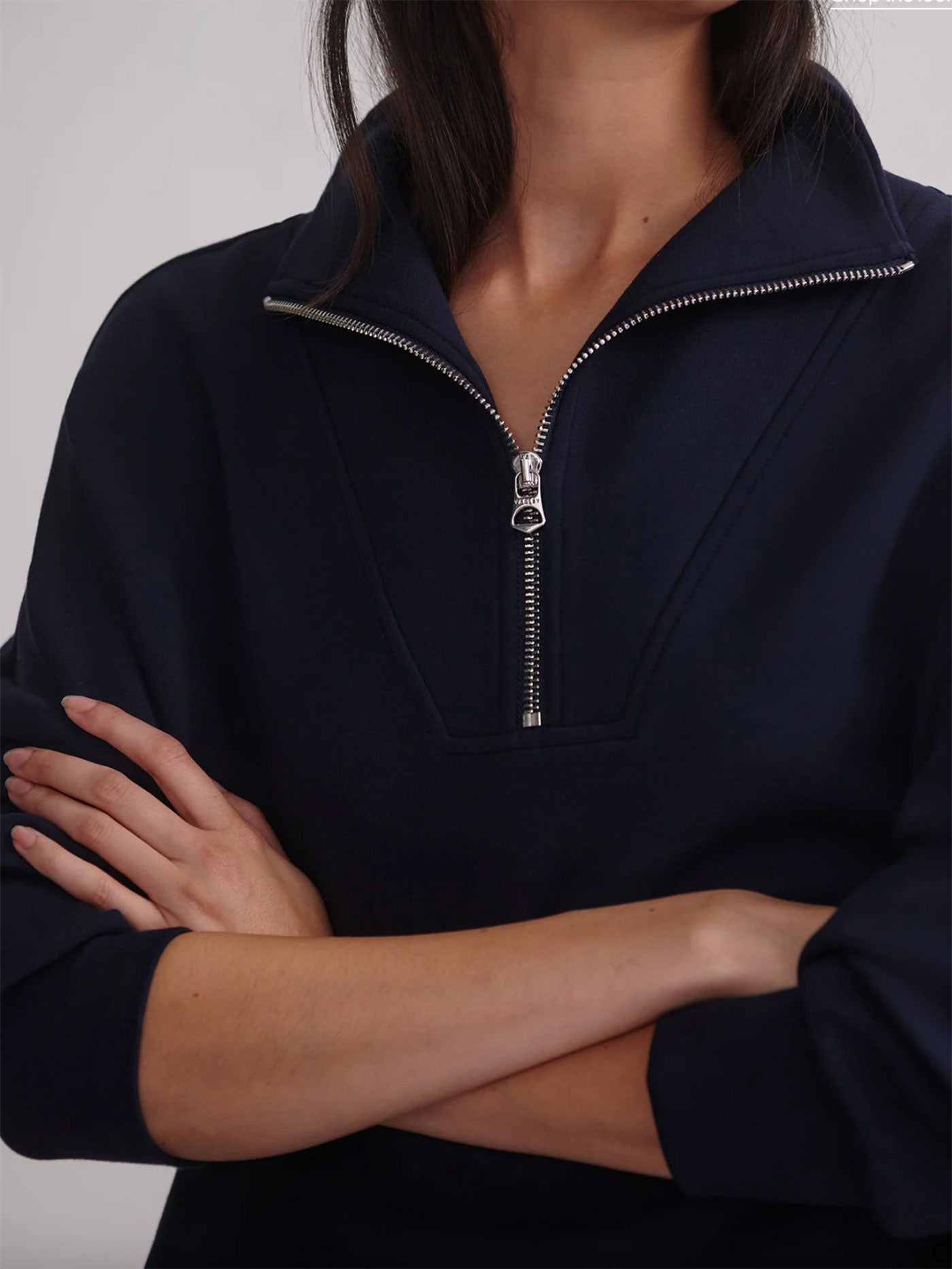 Cut to an oversized fit, this versatile Navy sweatshirt features a panelled, half-zip neck and deep cuffs with hem band. Made with Varley's signature DoubleSoft® fabric, it's designed to be worn on-the-go.