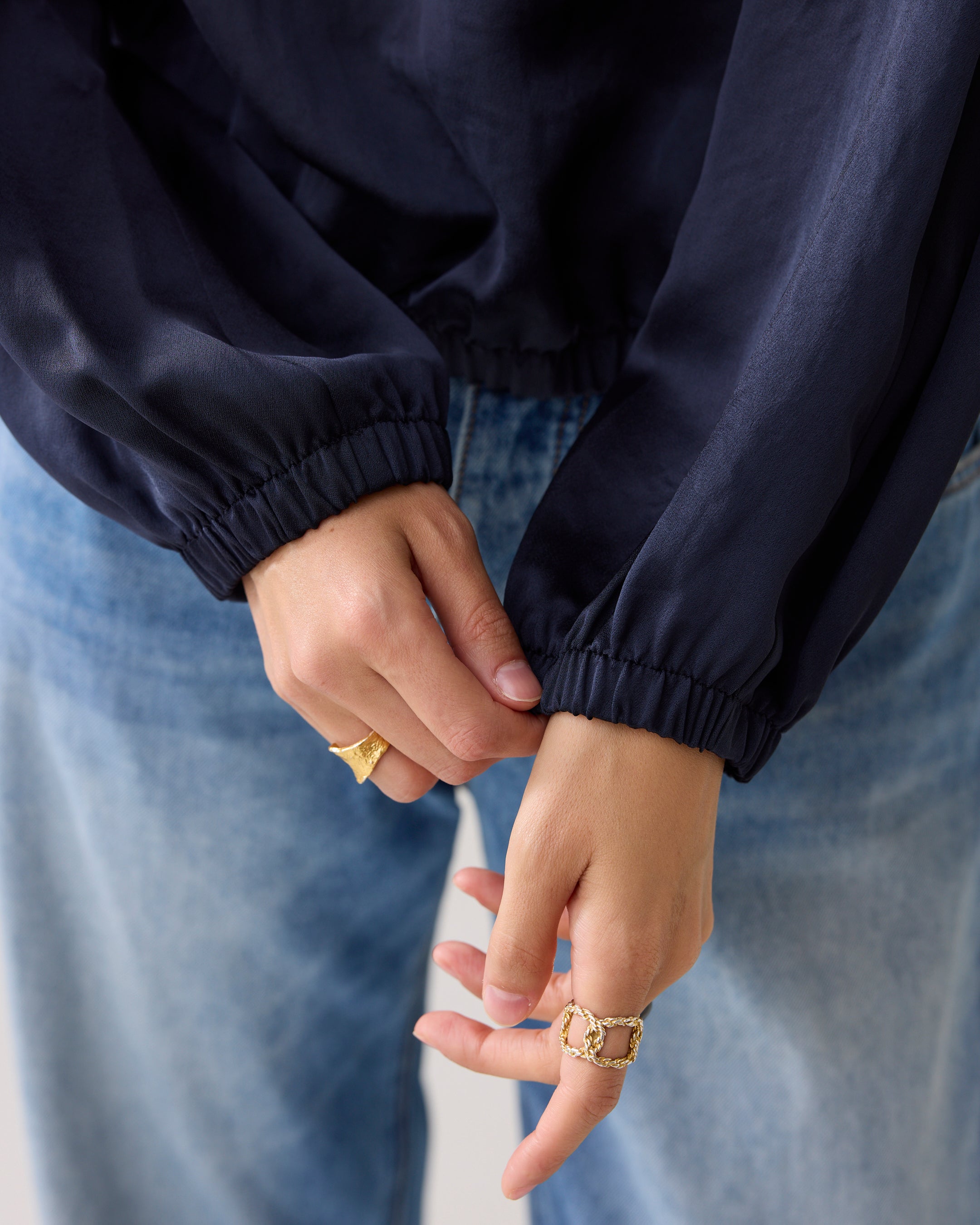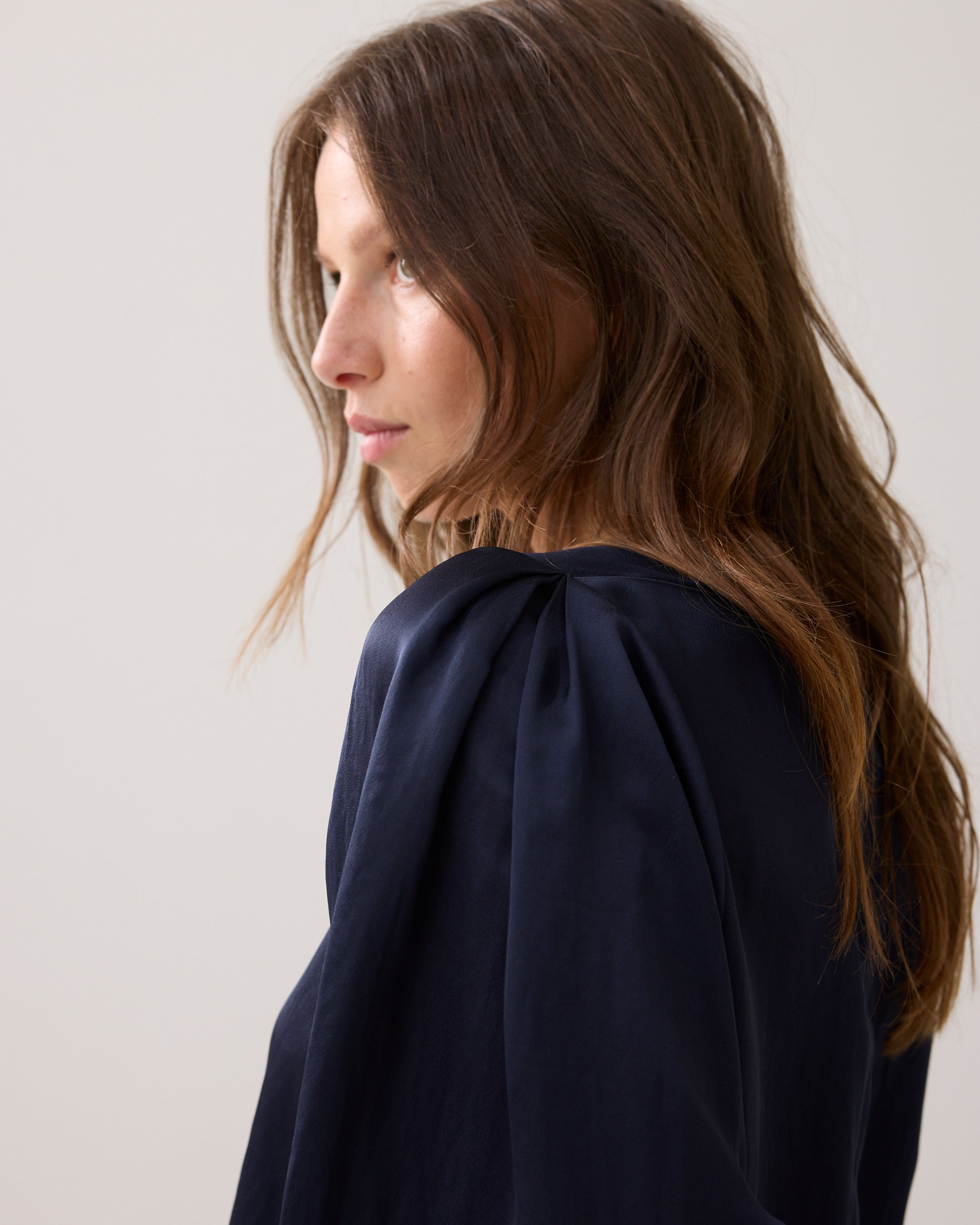 This autumn, navy is the new black, and will effortlessly transform many of your outfits from simple to always chic. With long blouson sleeves and a feminine v-neckline, this piece brings a happy balance between casual 'I just threw this on' style and true elegance.