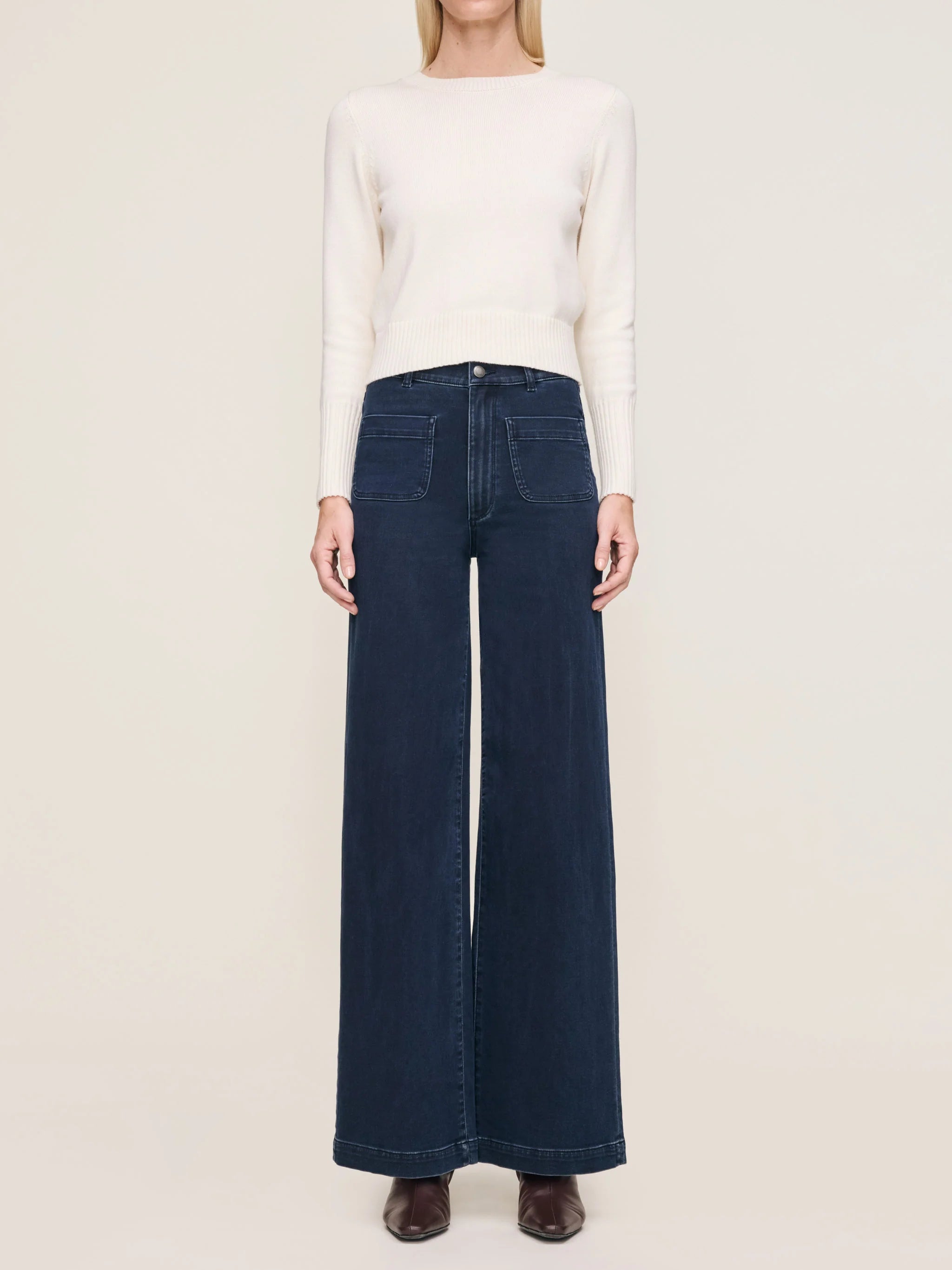 Bring modern polish to your denim rotation with this high-rise wide-leg style. Designed to fit snugly at the waist and seat before tapering outward from the thigh, it creates a flattering, elongated silhouette. The deep blue-black wash with tonal stitching and silver hardware keeps the look sharp, while a clean hem and black back patch add a refined finish. With its low stretch, low hold, and mid-level softness, this pair delivers an authentic denim feel with just the right amount of comfort. A versatile style that’s as easy to dress up as it is to wear casually.