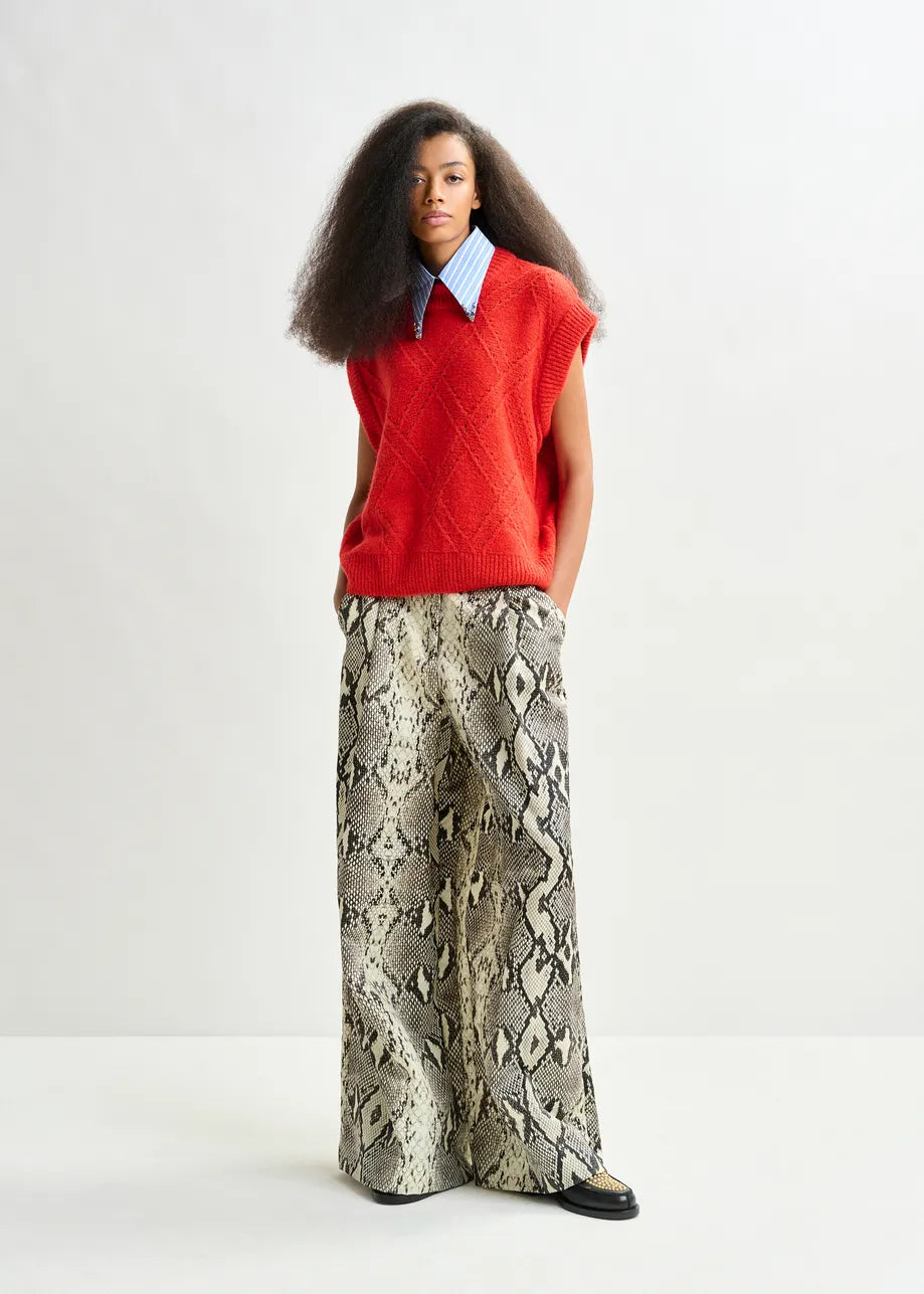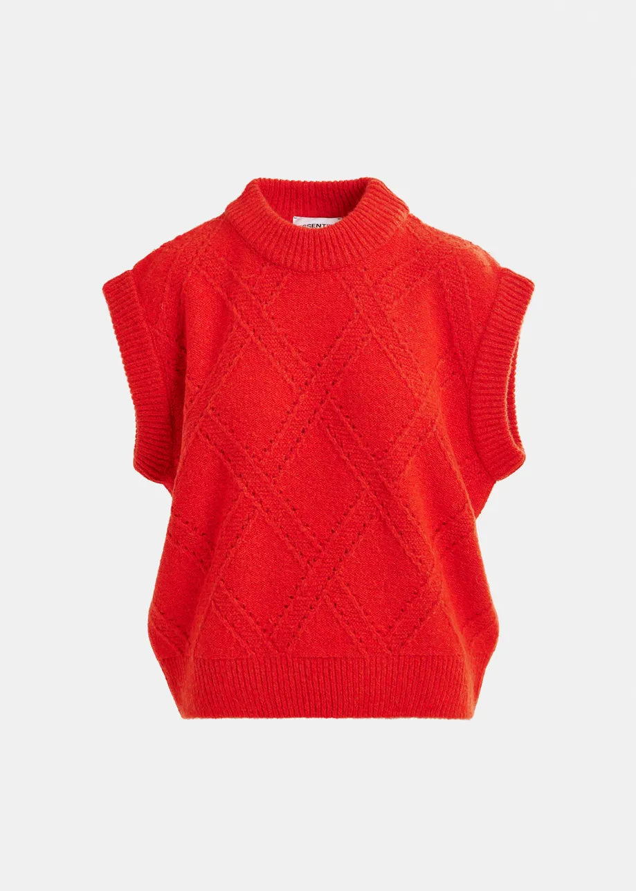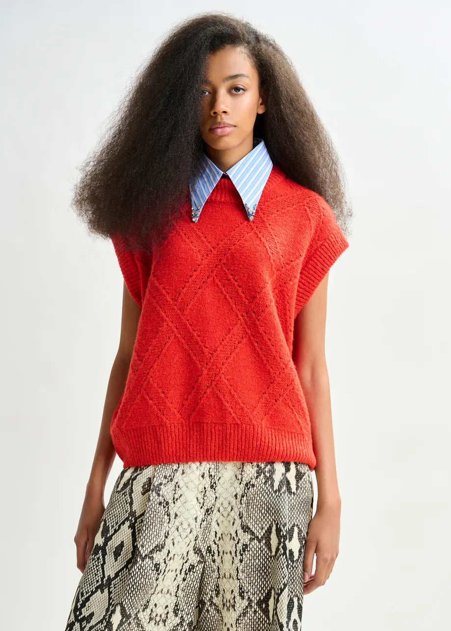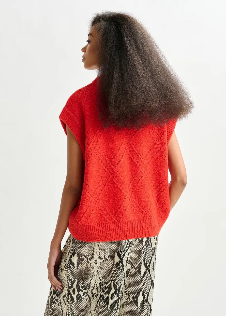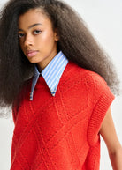 This sleeveless sweater is a vibrant addition to any outfit. Bright, bold and bursting with personality, this is a fun way to jazz up a simple white shirt and jeans for the winter months ahead. The boxy fit and dropped shoulders keep this knit casual and effortless for easy dressing.