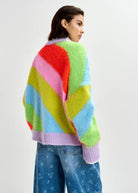 Intarsia knitted sweater containing alpaca wool features a playful striped pattern with pops of bright colors. The relaxed silhouette is enhanced by the dropped shoulders and neatly finished with ribbed trims.