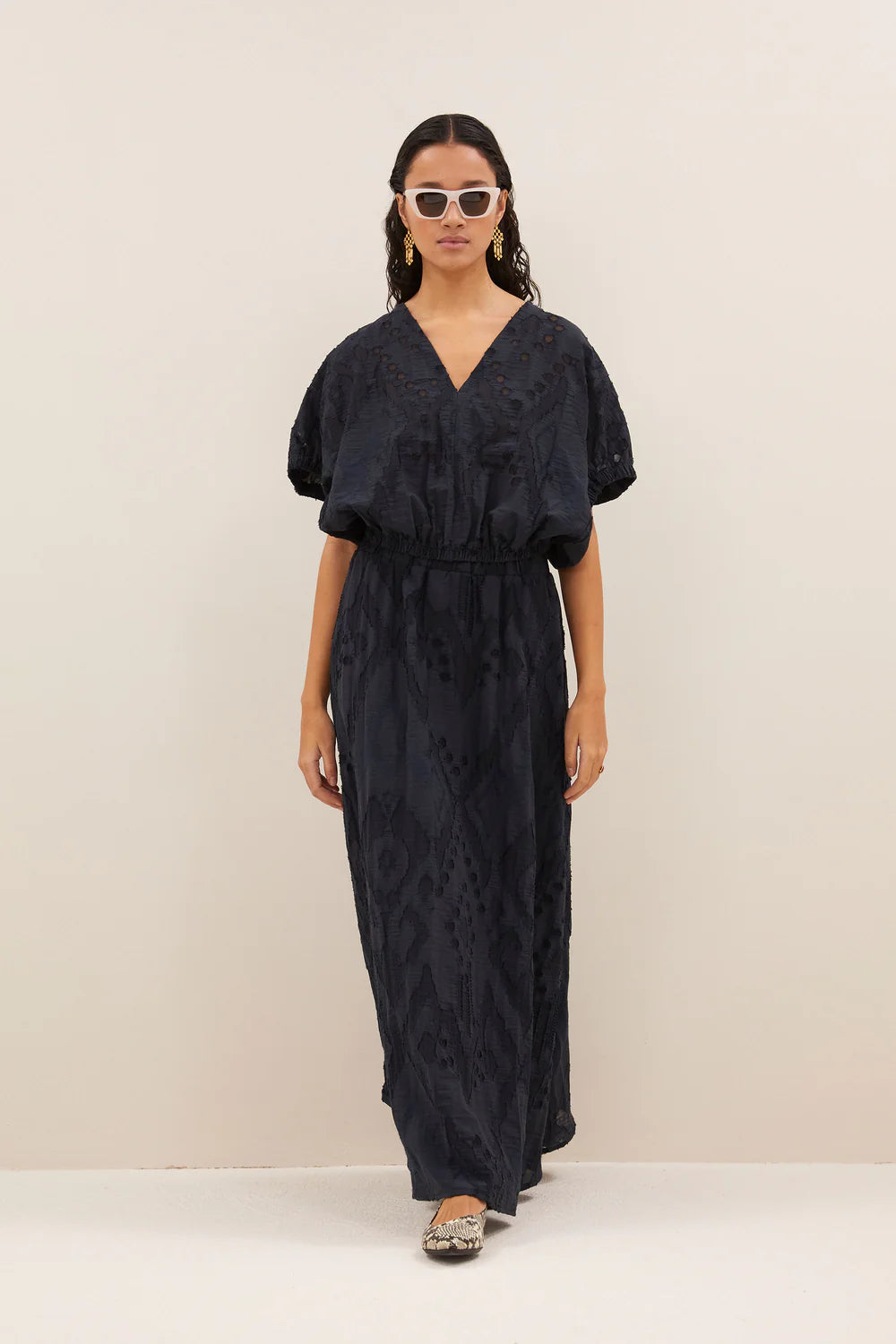 Navy is the new black, and this maxi skirt brings the best of elegant style to your look. Effortlessly chic and just as comfortable, this skirt has an elastic waistband and embroidery all over for a forever flattering look, this skirt is a serious must have!