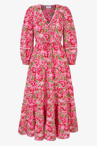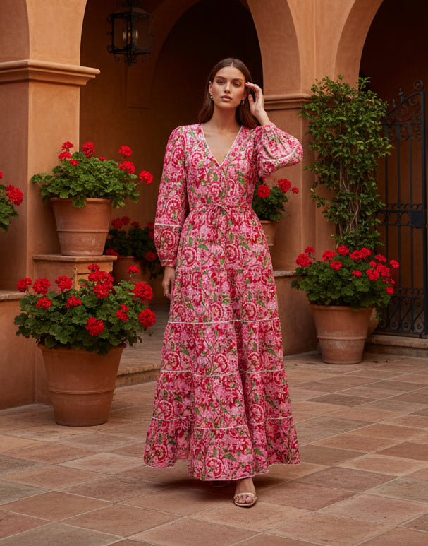 Effortless summer elegance in pure cotton. The Maria Dress features a flattering V-neckline and long sleeves, perfect for warm days with understated coverage. Rendered in our exclusive Geranium Jaal floral print—a contemporary take on traditional botanical design. Breathable, versatile, and designed to transition seamlessly from day to evening