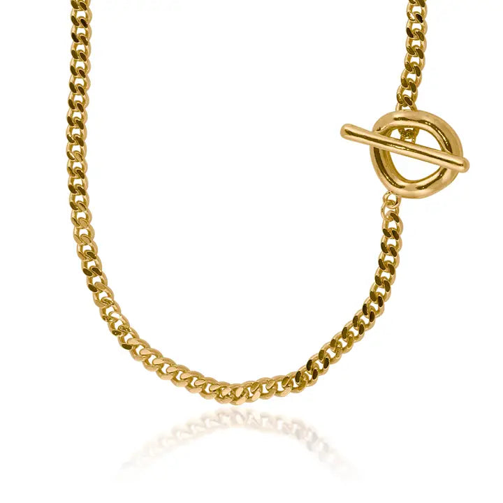 Turn heads with this chunky statement chain necklace, featuring bold links and a modern T-bar closure. Its oversized, edgy design makes it the perfect standout piece for layering over simple tops or adding instant flair to any outfit. Sleek, versatile, and undeniably contemporary, this necklace is a must-have for jewellery lovers who like to make a confident style statement.