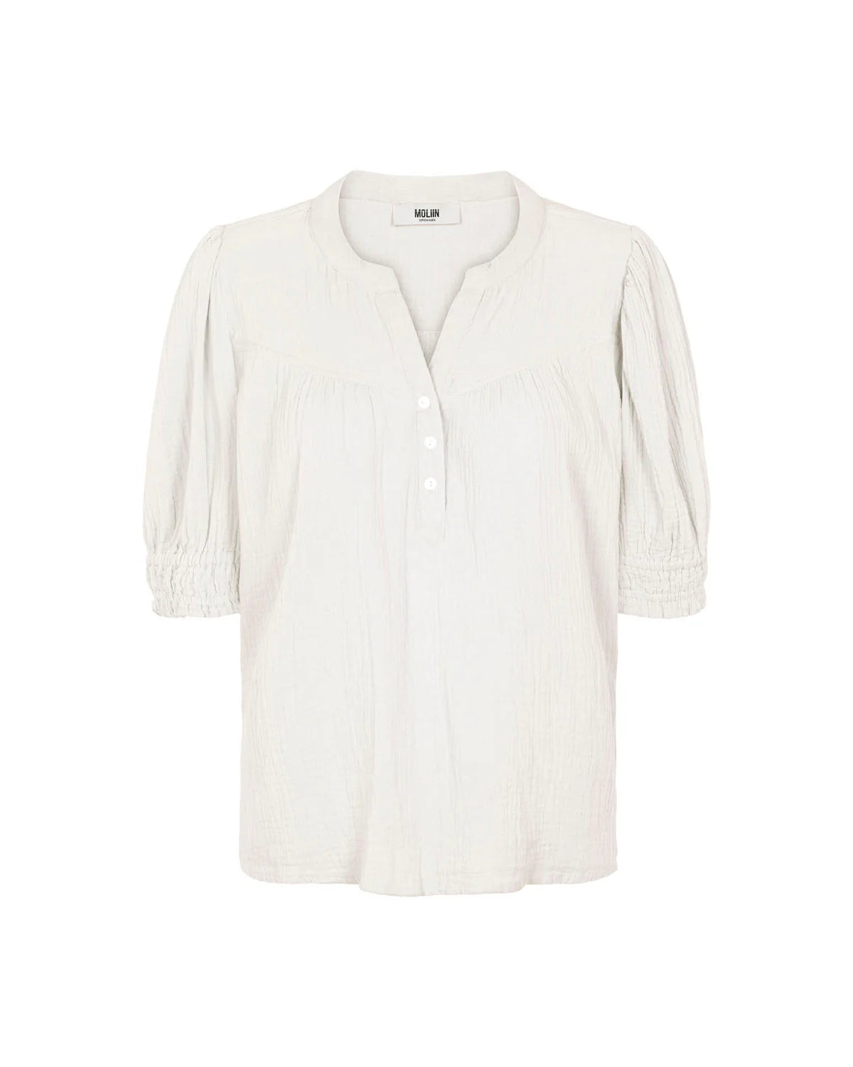 Owen is a feminine short-sleeved blouse with softly puffed sleeves that fall to around elbow length. The top features a delicate slit opening with buttons at the neckline and a decorative yoke seam with gentle gathers, giving it a light and romantic expression. Elasticated sleeve hems. This versatile everyday style will work perfectly on its own or paired with the Bailey skirt for at complete set.