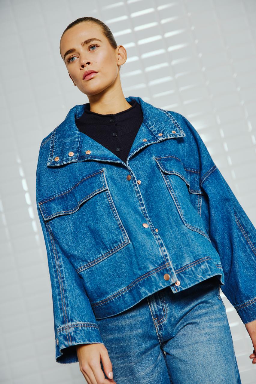 Bring a bold twist to classic denim with this loose-fit jacket. Cut from sturdy denim quality, it’s designed with dropped shoulders and wide sleeves finished with press buttons for extra attitude. The stand collar adds a modern edge, while the hip-length cut keeps it easy to style. Big patch pockets with flaps bring function and flair to the front, and press-button closures tie the look together. Effortless, versatile, and just the right amount of oversized, this is denim done differently.