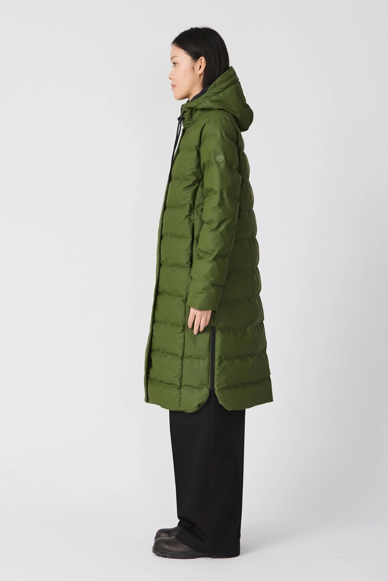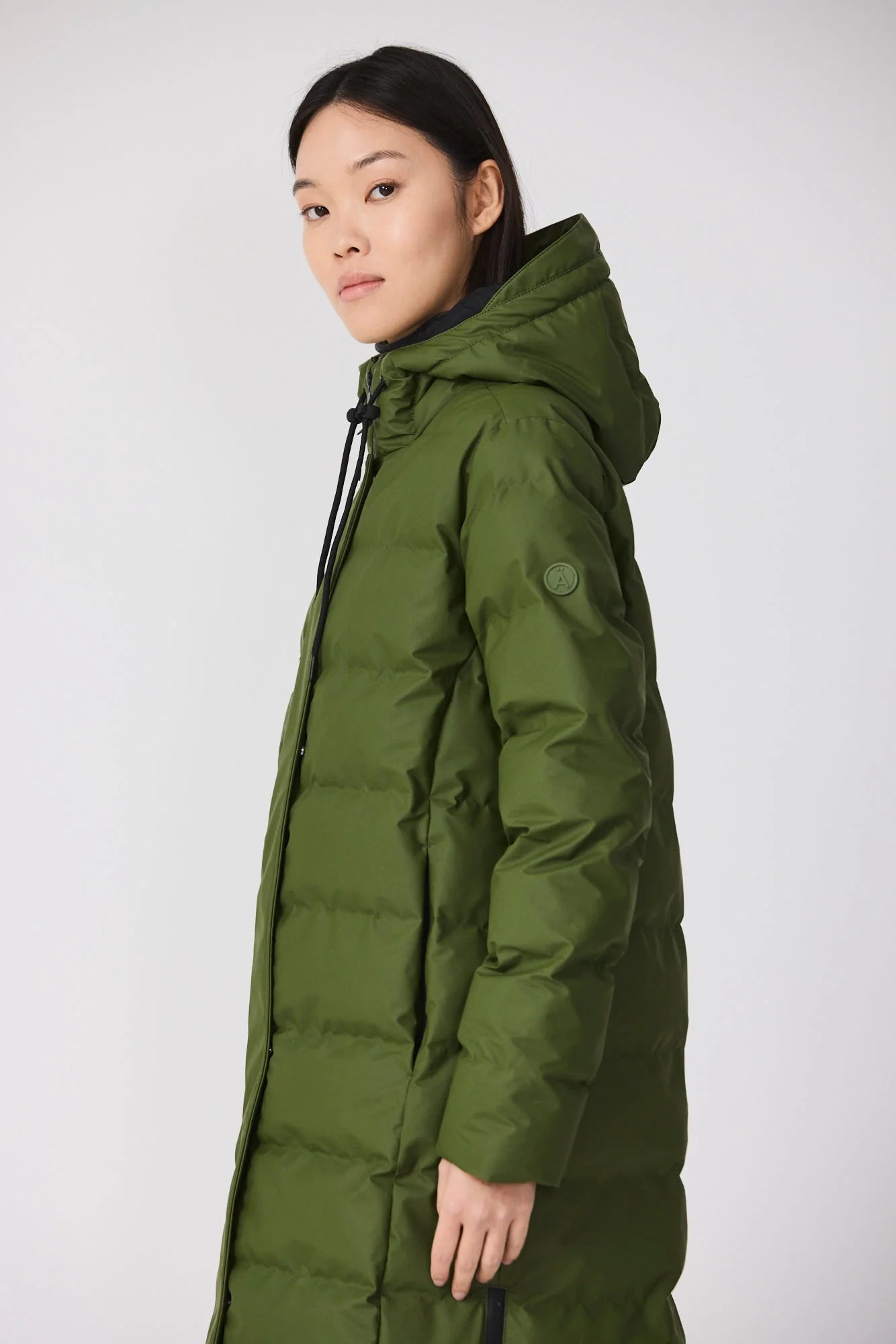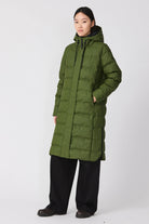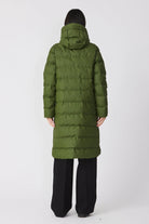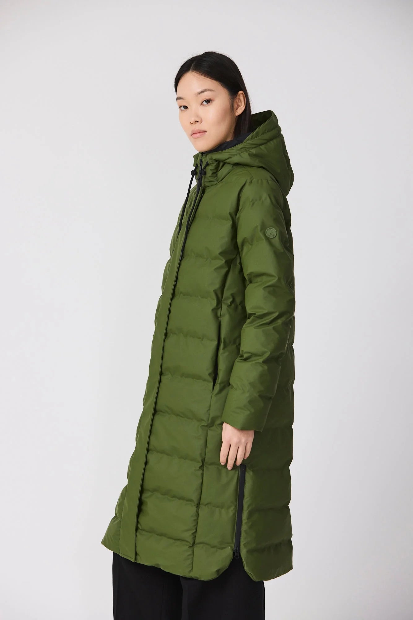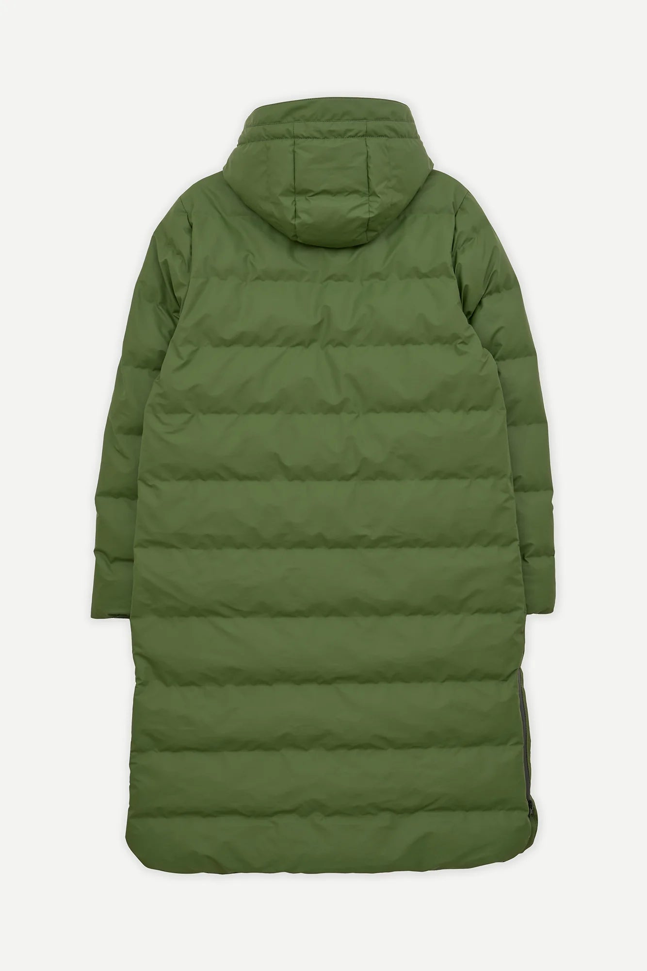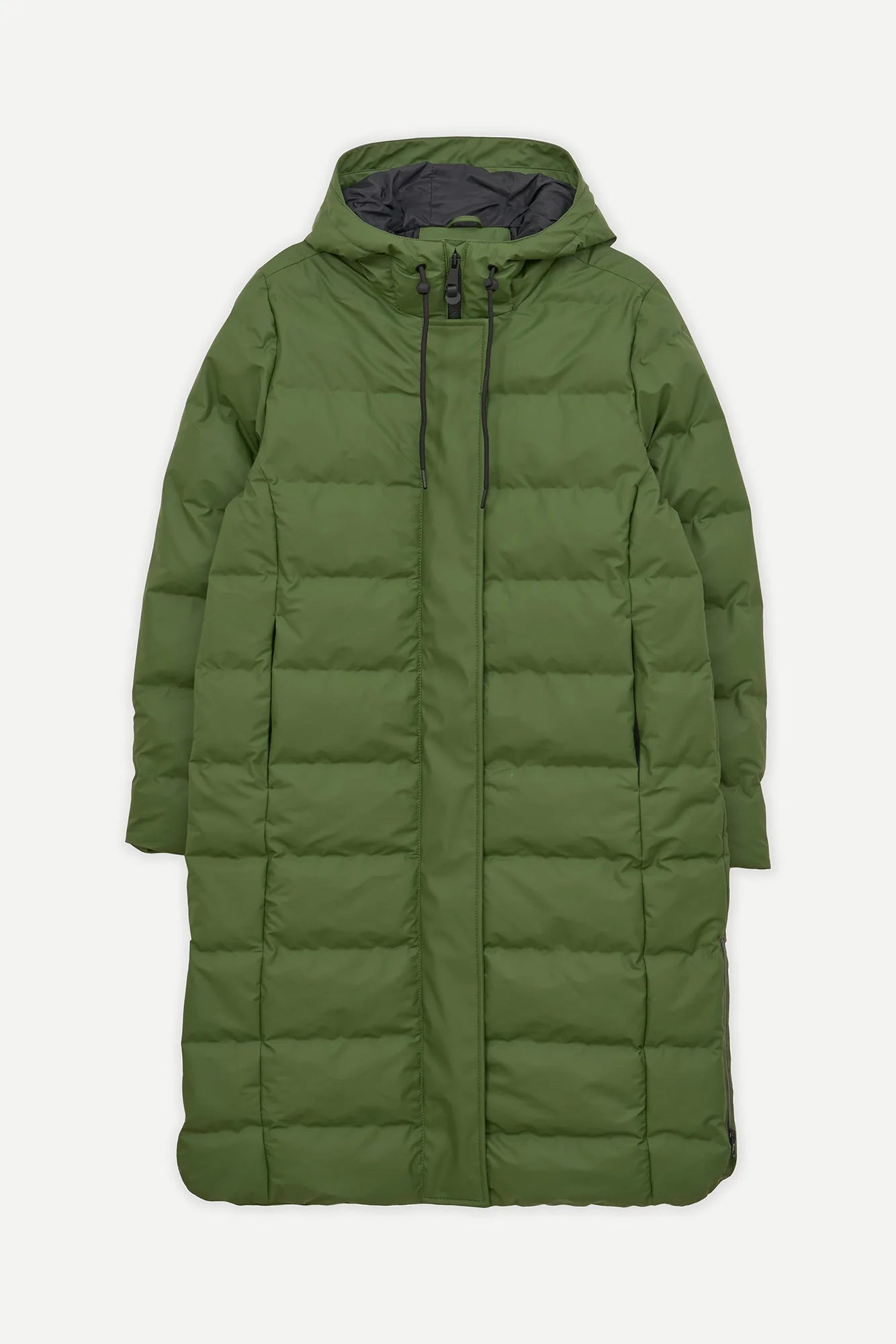 A puffer padded coat is a staple coat for any casual rainy day. This 100% waterproof jacket is made from PETA approved vegan and featherless down, and is fully insulated for constant warmth. With a zip up front and hooded style, this striking green coat brings brightness to even the gloomiest of days.