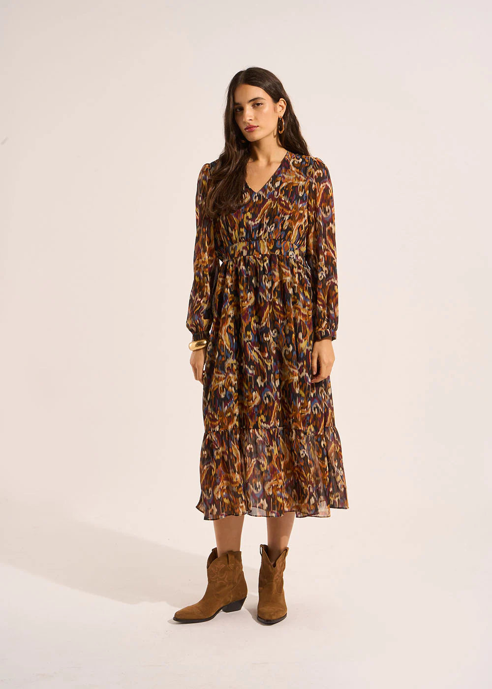 Meet the RELOYA Dress, a statement piece that blends effortless elegance with everyday comfort. Its long, flowing silhouette moves beautifully, while the multicoloured print adds a vibrant pop of personality to your wardrobe.The smocked waistband flatters the figure, and the ruffled hem gives it that perfect touch of feminine flair. With long puff sleeves and a soft V-neckline, this dress feels just as special for brunch with friends as it does for a weekend getaway. Style it with ankle boots and a leather jacket for a relaxed daytime look, or switch to heels and bold jewellery when you want to take it into the evening.