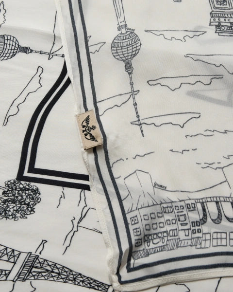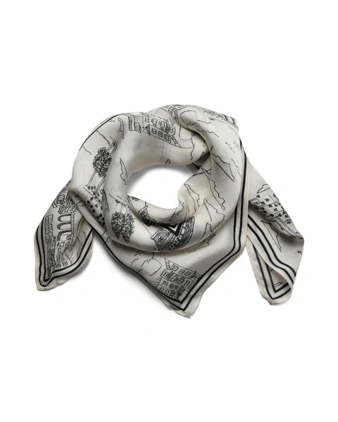 The tale scarf, a small but mighty accessory that can turn the most simple of outfits into a runway-ready look. In a beautiful satin, this scarf features the icons of Paris printed over it for that extra Je ne sais quoi.