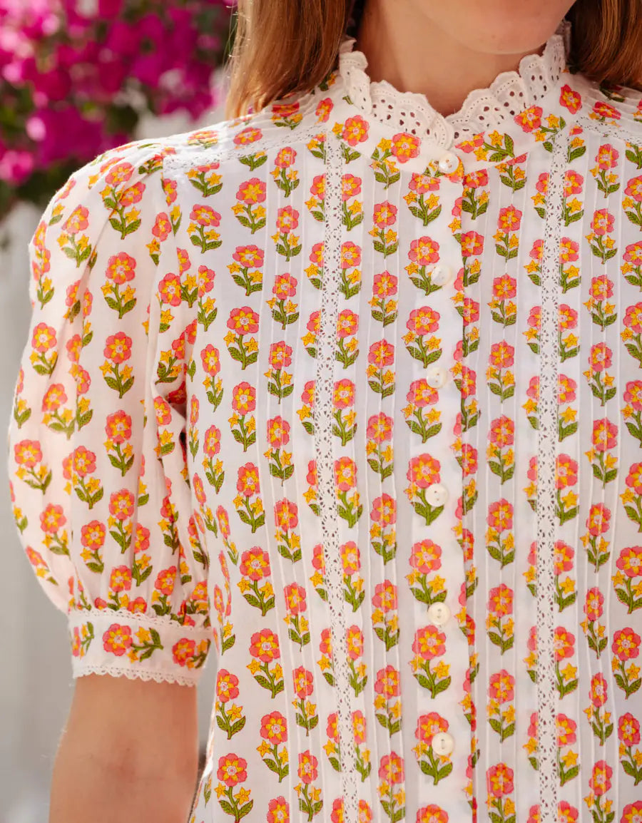 Block-printed by hand in our delicate Pink Floret buta, our Vera blouse is a versatile addition to your wardrobe. Inspired by much-loved vintage blouses, it features pretty cotton lace inserts, delicate pin-tuck detailing and a flattering, ruffled lace neckline. We love the feminine, puff sleeves finished with intricate cotton lace. Style with vintage mom jeans for a timeless look, or pair with one of our block-print skirts for a playful print clash. A useful piece you’ll reach for again and again.