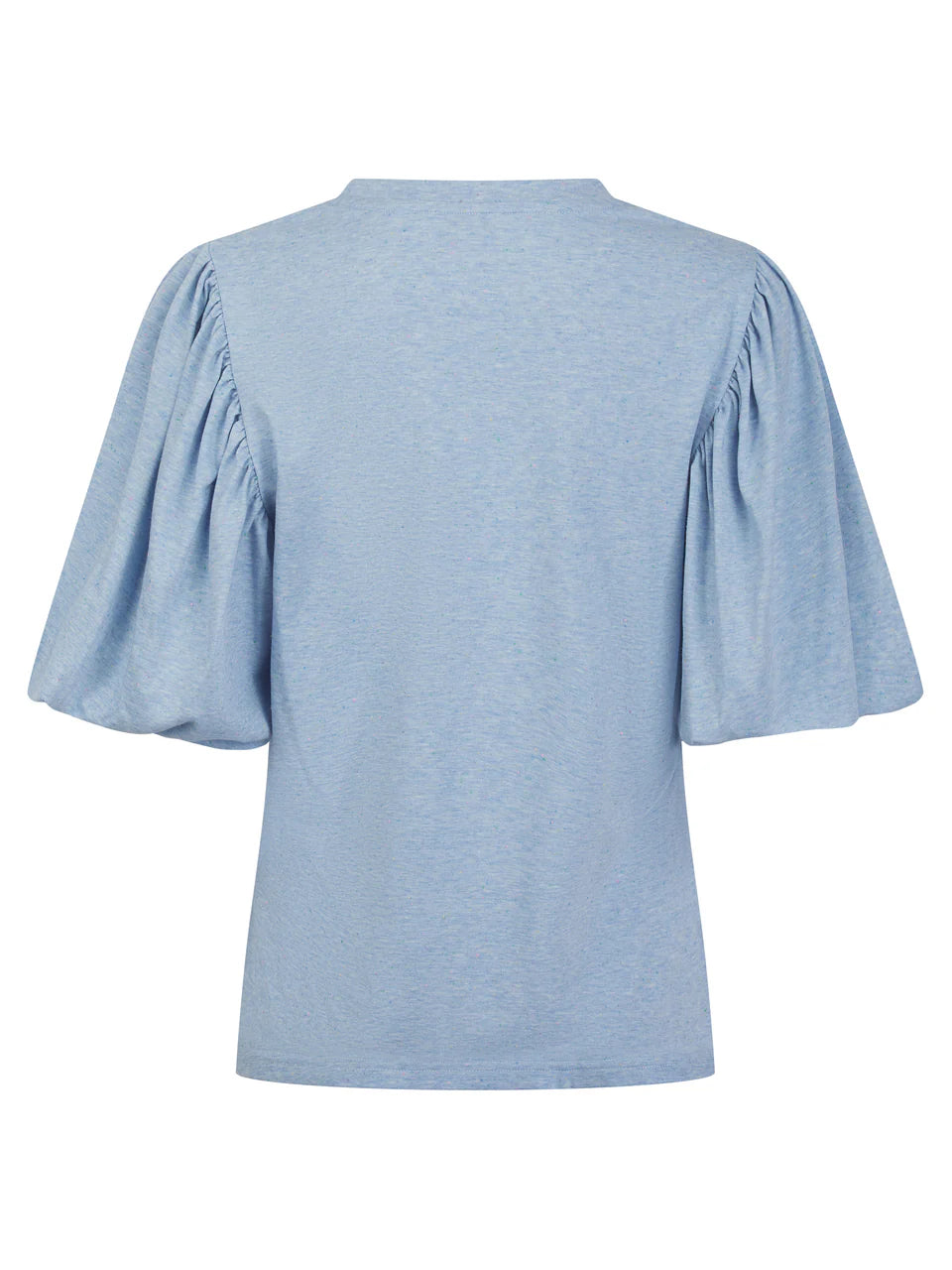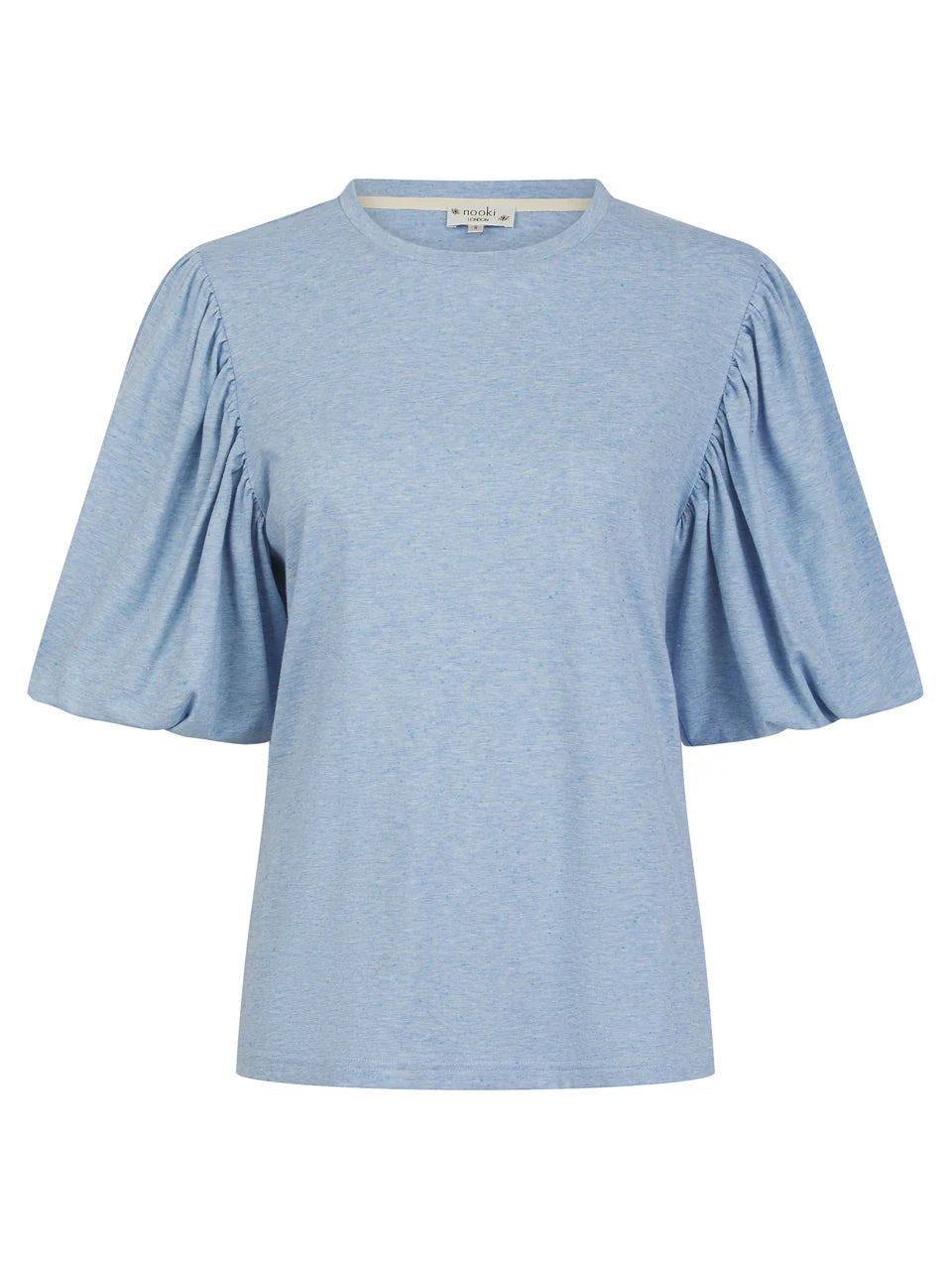 This top takes your usual t-shirt and makes it better. With beautifully puffed sleeves for drama and coloured flecks in the fabric, this top is sure to make your casual outfits a whole lot better. We think this tee looks great under a gilet with your favourite denim jeans.