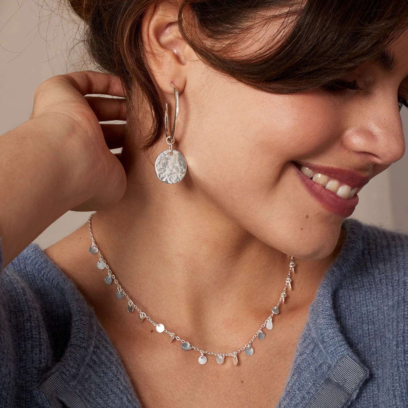 The Esmeralda earrings feature a lightweight silver hoop with a textured hammered coin. Sleek and stylish, these earrings are perfect for day-to-night wear.
