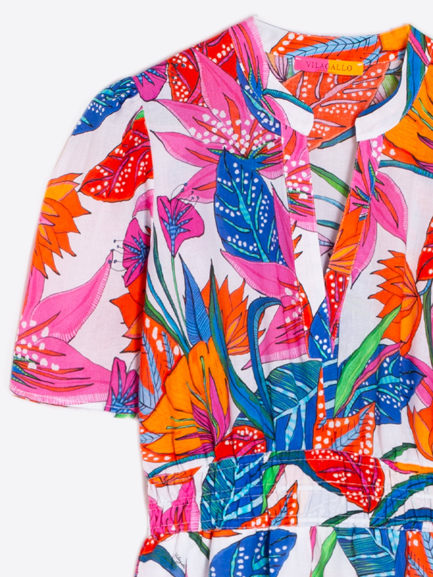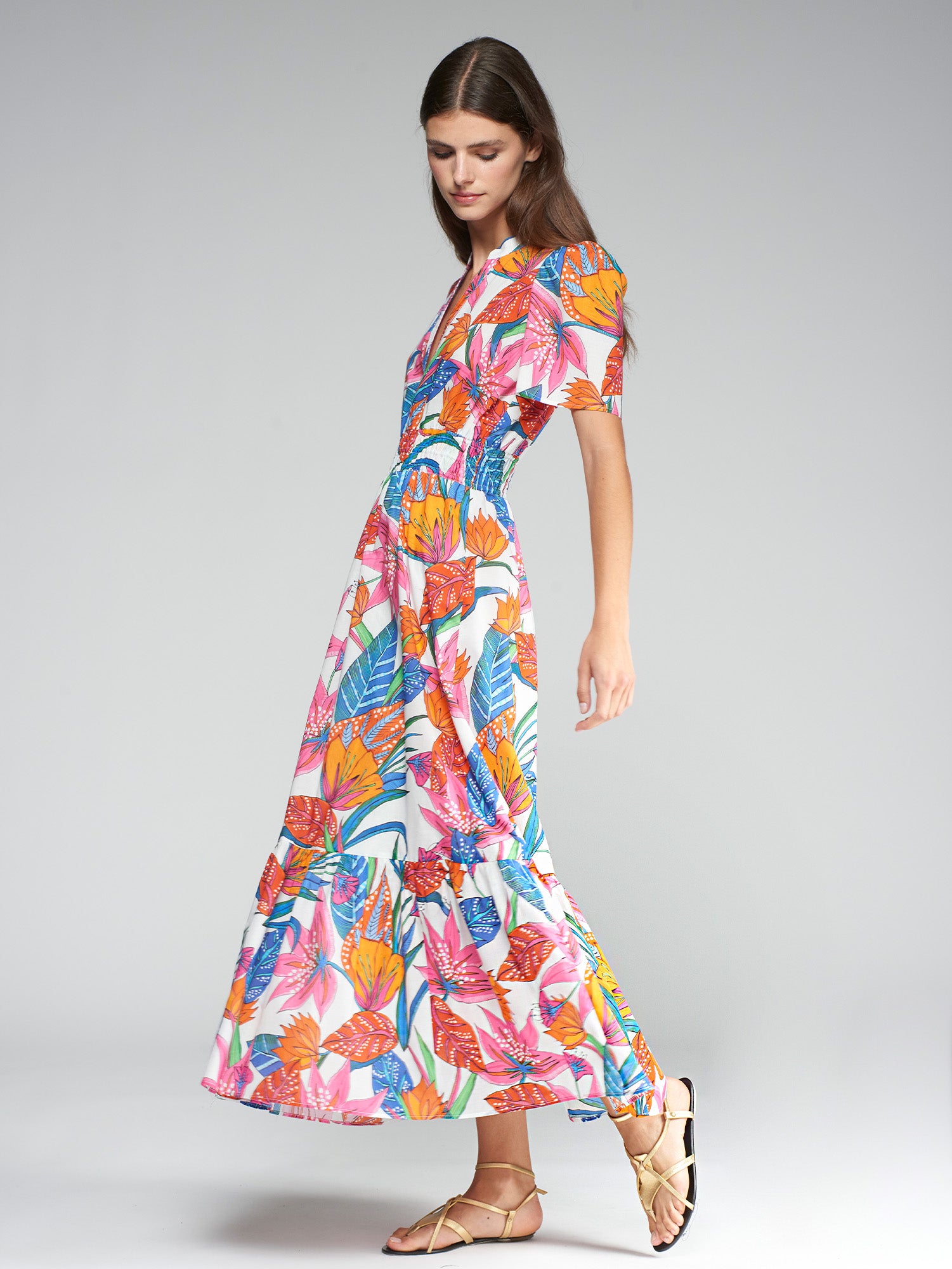 Fancy a trip to club tropicana? With this dress you can enjoy the fun and sunshine thanks to its beautiful lightweight material and summer suitable design. With a stand-out tropical print with florals all over, this V-neck dress can be worn now with a leather jacket and boots, and later with some tan sandals.