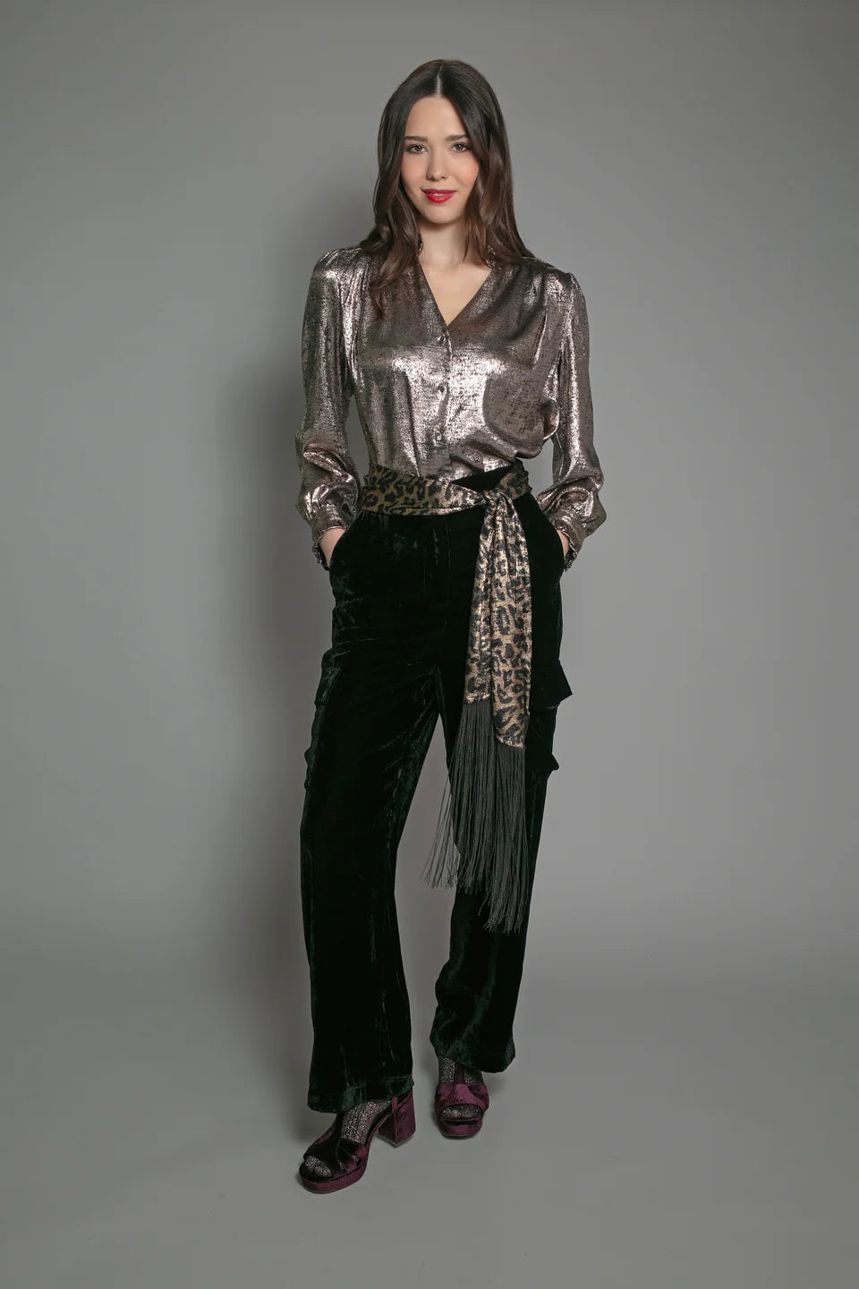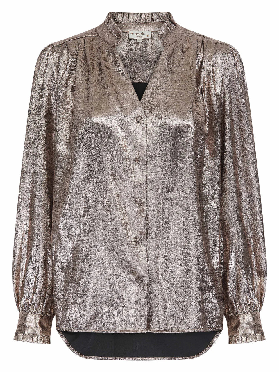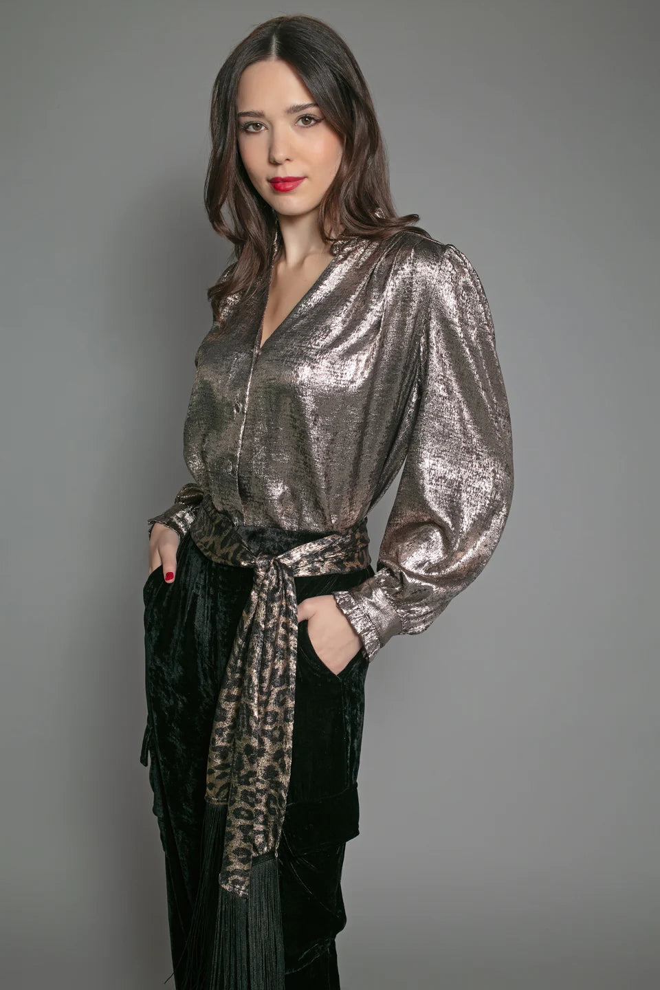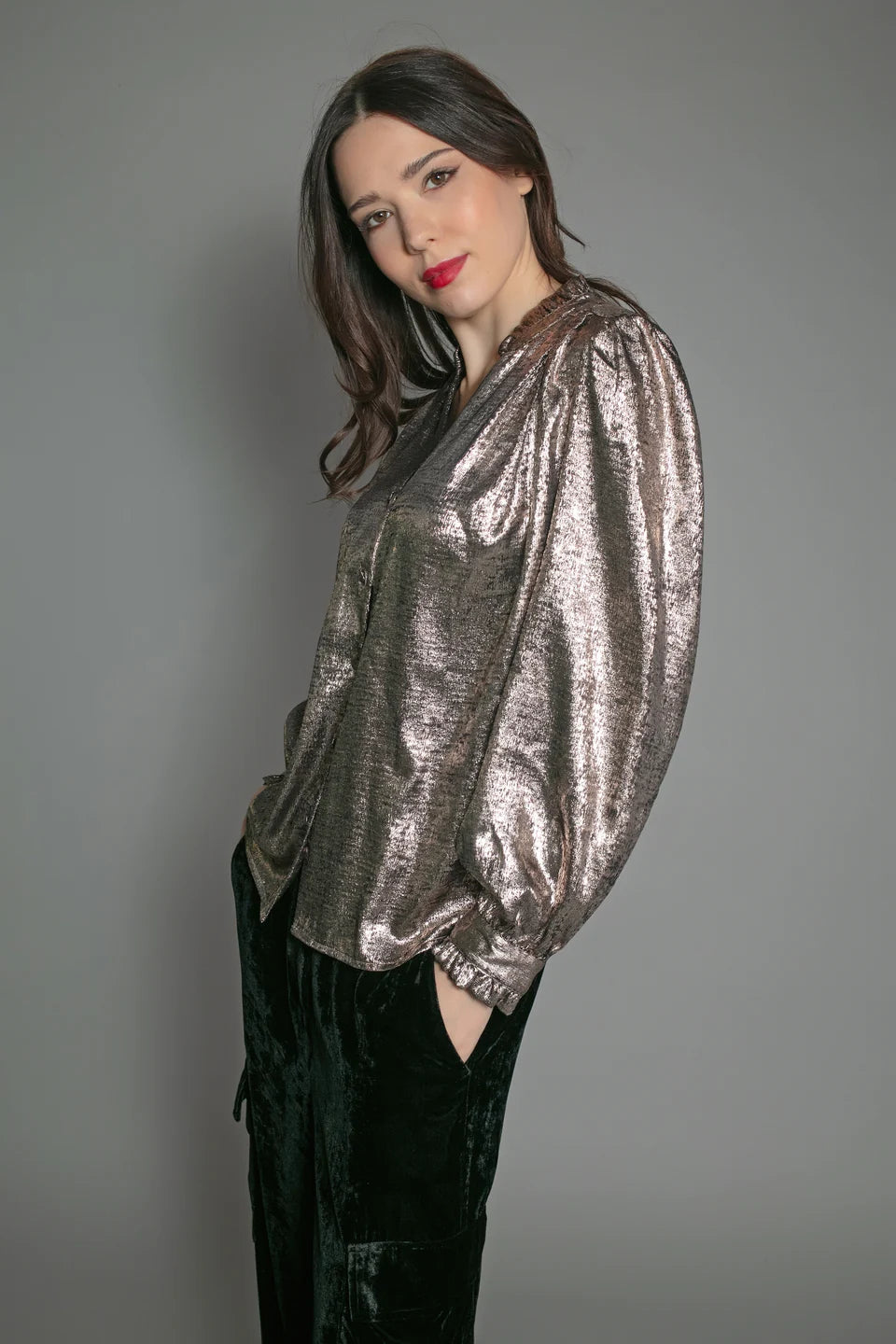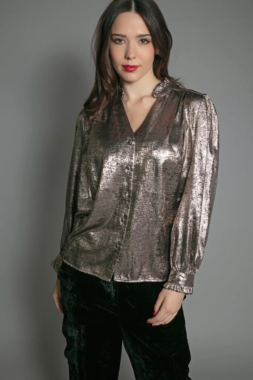 This light bronze Sylvia Lame Blouse is both shiny and shimmery, perfect for a festive look. With a flattering v-neckline and convenient button up feature, it's a fashionable piece for any occasion.