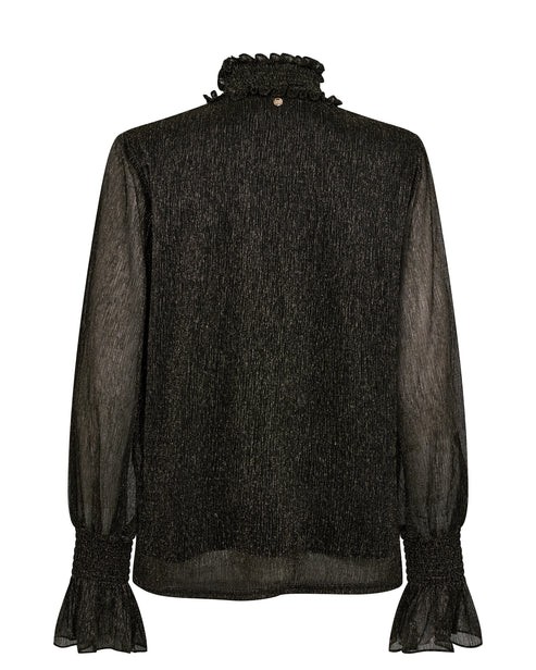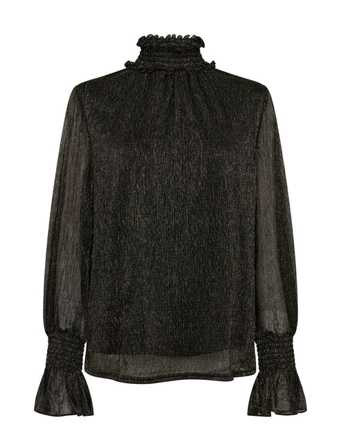 This shimmery blouse makes the perfect evening statement. With a high neck, detailed with ruching and gathering, this blouse gives off a luxurious look. The balloon sleeves add an extra statement to this beautiful winter blouse.