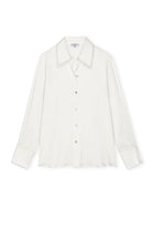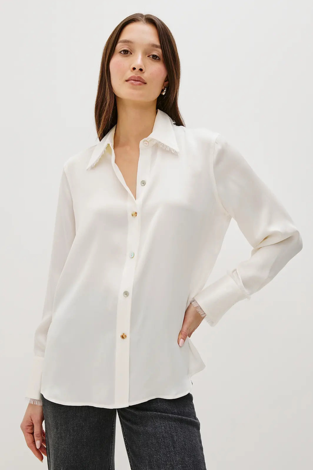 This shirt may be plain in colour and design, but it is a true stand out. Made from 100% silk, this piece screams pure luxury thanks to it's impeccable design with feminine charm in mind. The edges of the collar and cuffs are finished with an intentional feathered frayed effect, bringing a whimsy feel whilst remaining elegant. There are no limits to how you style this blouse.