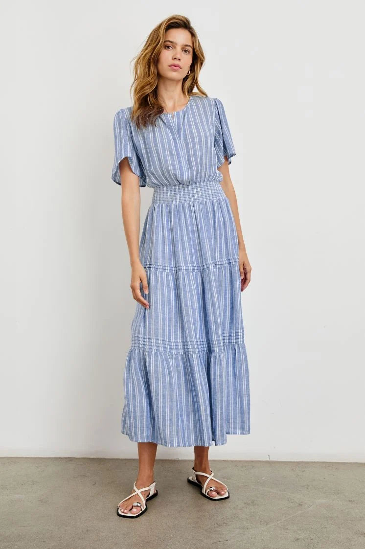 This striped dress is a summer classic for casual days out. In a tired effect with an elastic waistband, this dress couldn't be more flattering! Simply pair with tan sandals and a basket bag, fit for days near the beach.