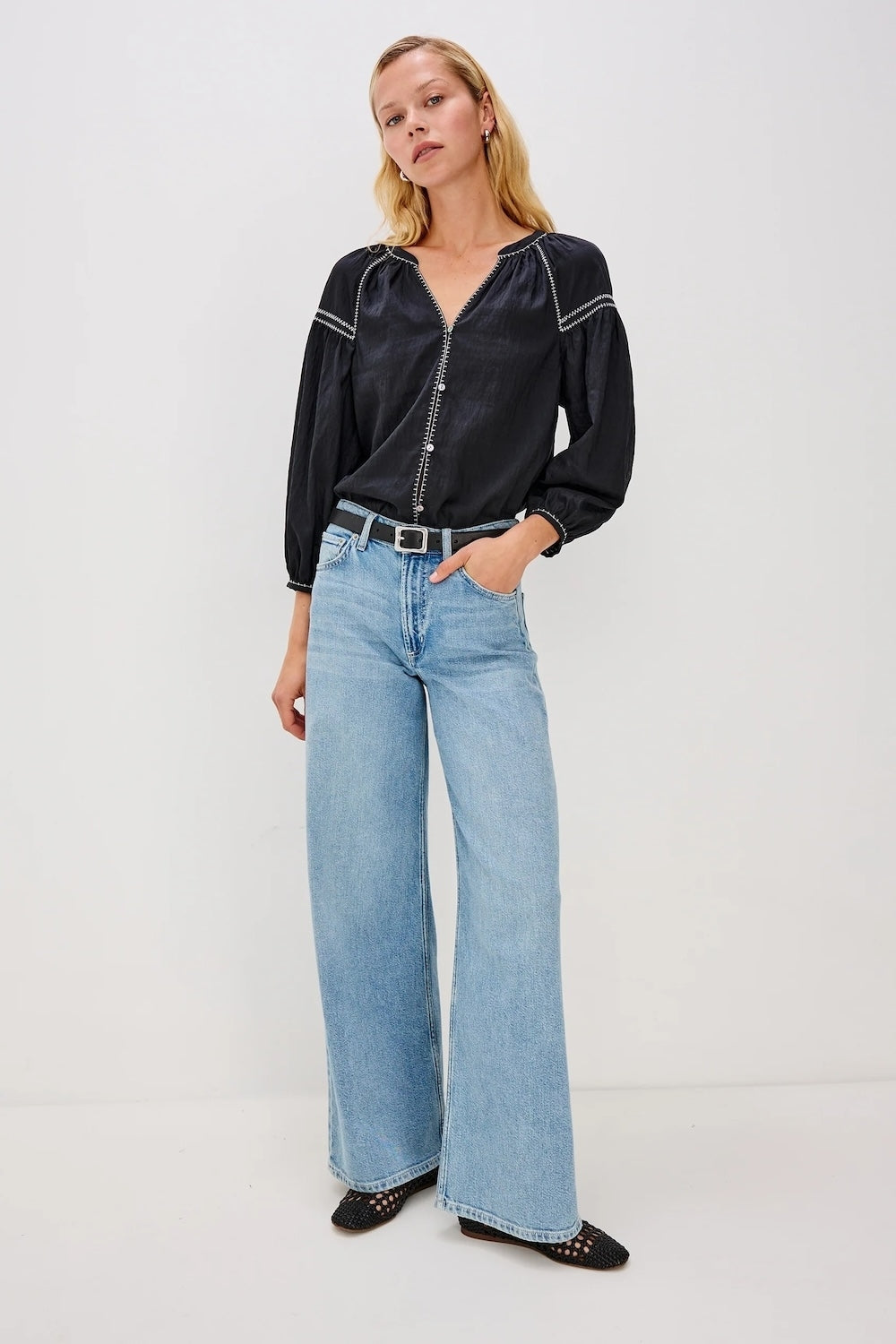 The outfit possibilities are endless with this classic blouse. In a classic black, this blouse makes a statement without any effort, so you can look and feel stylish day after day. The crisp cotton and delicate feminine details are simple, but timeless for year long wear. We think that a light pair of jeans are the simplest but most effective way to style this blouse, just like in the image!