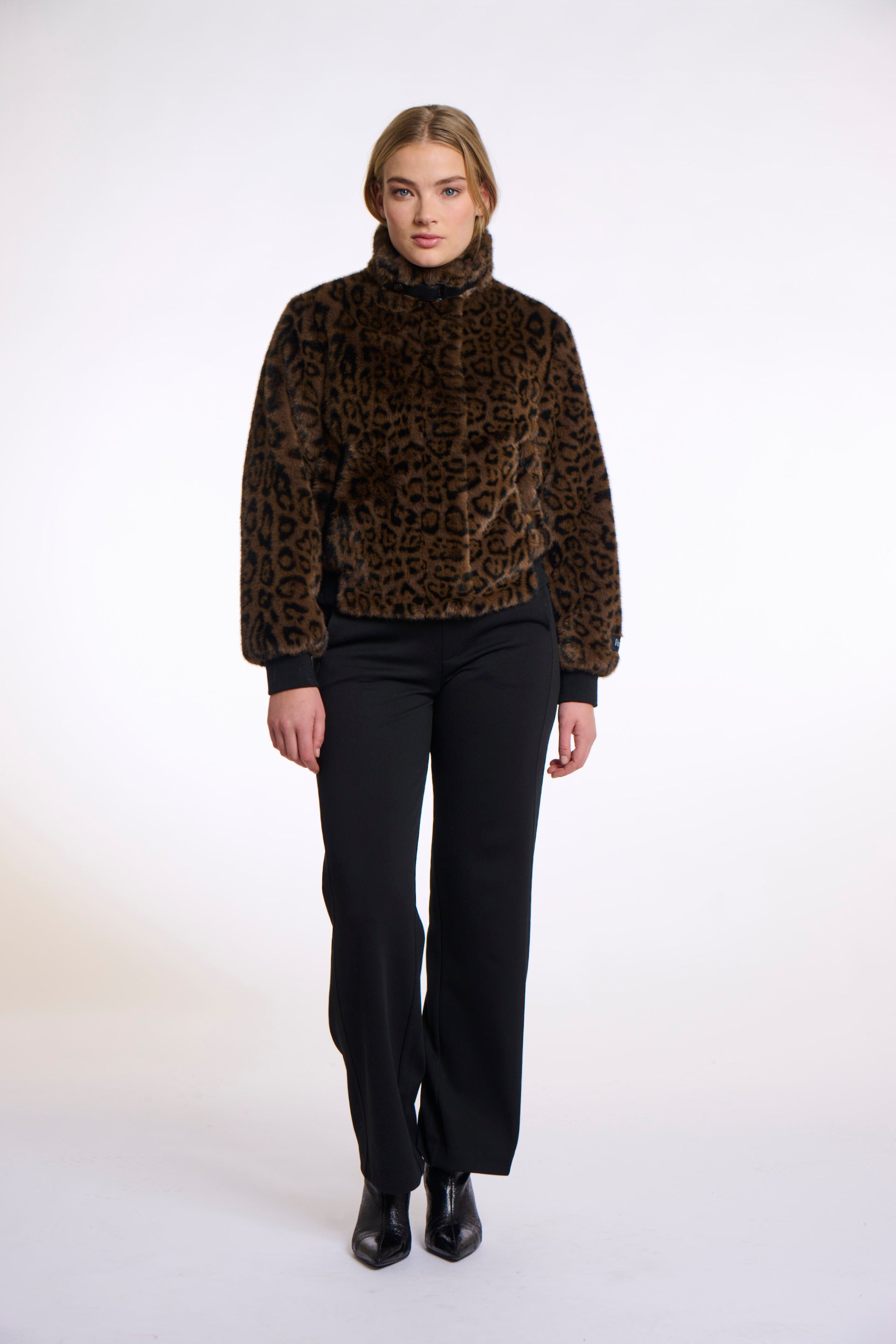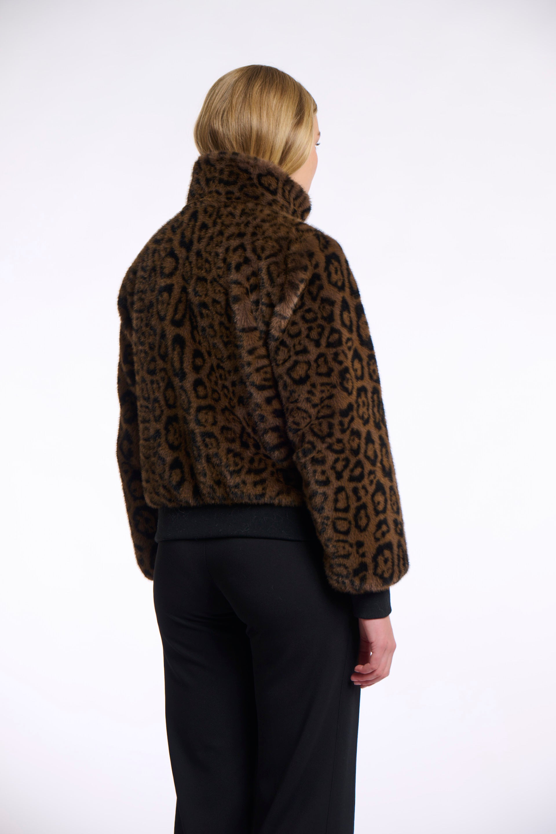 The pattern of the year is now ready to wear on this beautiful short faux fur jacket. With an all over print and plain design, this jacket is instantly eye catching without any effort. The high neckline and tapered sleeves and hem ensure that this jacket doesn't ruin your outfit, but simply enhances it!