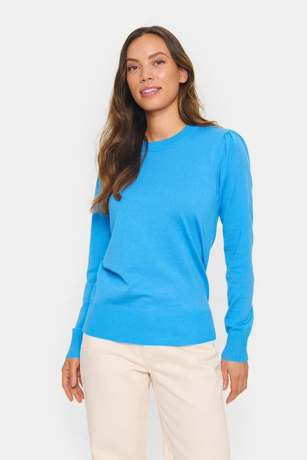 There is nothing more useful in your wardrobe than a classic pullover jumper, and the Mila from Saint Tropez is the ultimate capsule piece. In a vibrant blue colour, this pullover will pair with anything from funky trousers to your favourite jeans.