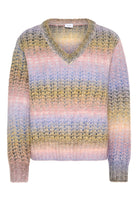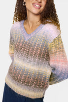 This knitted sweater features horizontal stripes in a collection of autumnal tones. With a casual fit thanks to a deep v-neckline and long sleeves, this casual knit can be thrown on with your jeans for any day out. The textured and lightweight yarn allows you to wear this knit all the way through to the spring, making it just as versatile as it is stylish.
