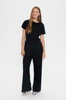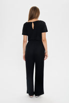 Sophisticated yet effortlessly wearable, this wide leg jumpsuit is designed to make an elegant statement. Crafted with a subtle shimmery surface, it catches the light beautifully, while the draped neckline adds a touch of soft glamour. The short sleeves and elasticated waistband create a flattering, comfortable fit that moves with you, and the keyhole detail at the back lends a refined finishing touch.