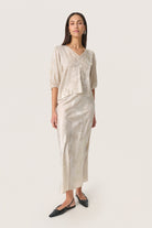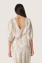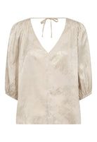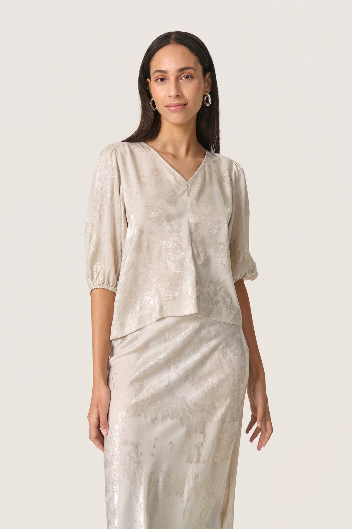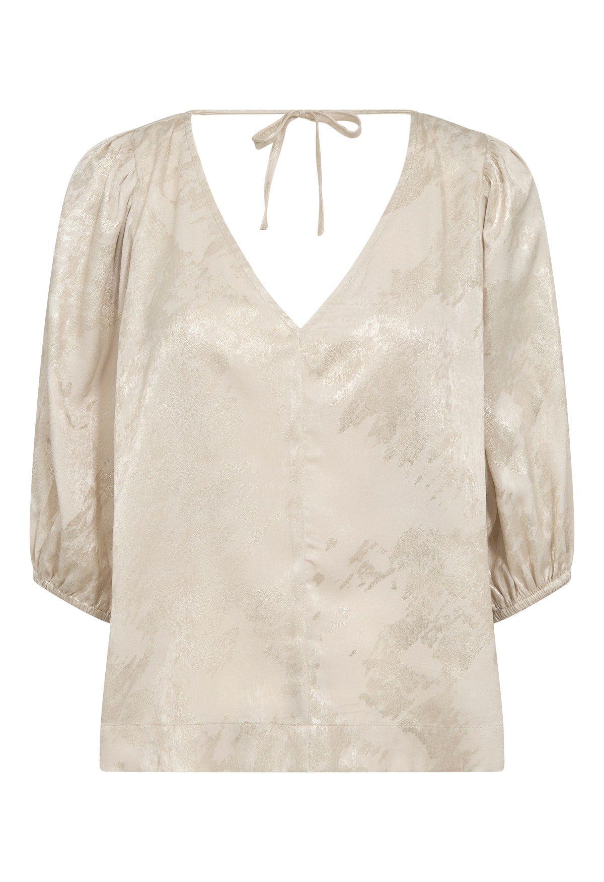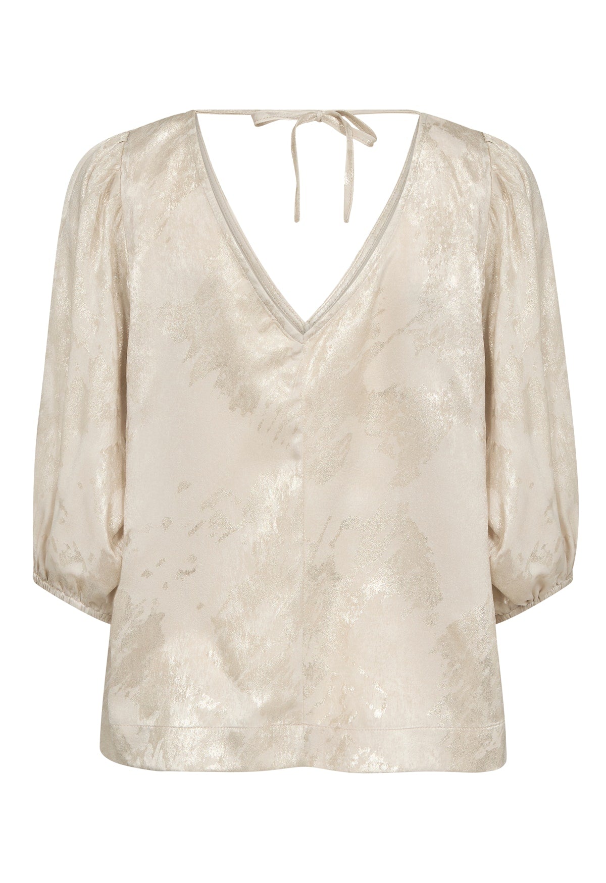 This blouse will be one you reach for day after day thanks to its feminine and simple design. Easy to style with jeans and a jacket in Spring to Linen trousers or shorts in the summer, this beautiful blouse features a shiny effect and a unique pattern in a ight neutral colour.