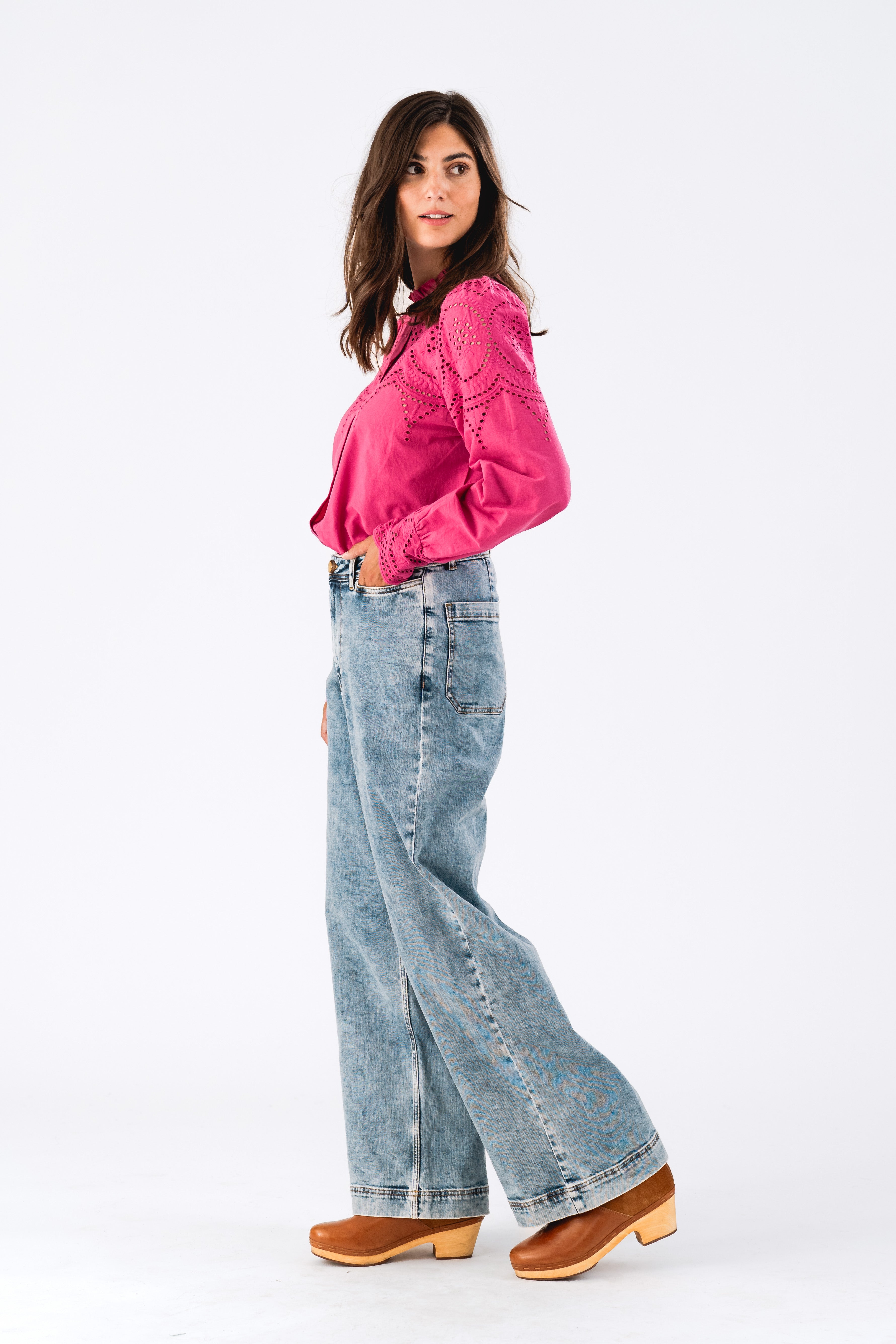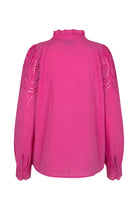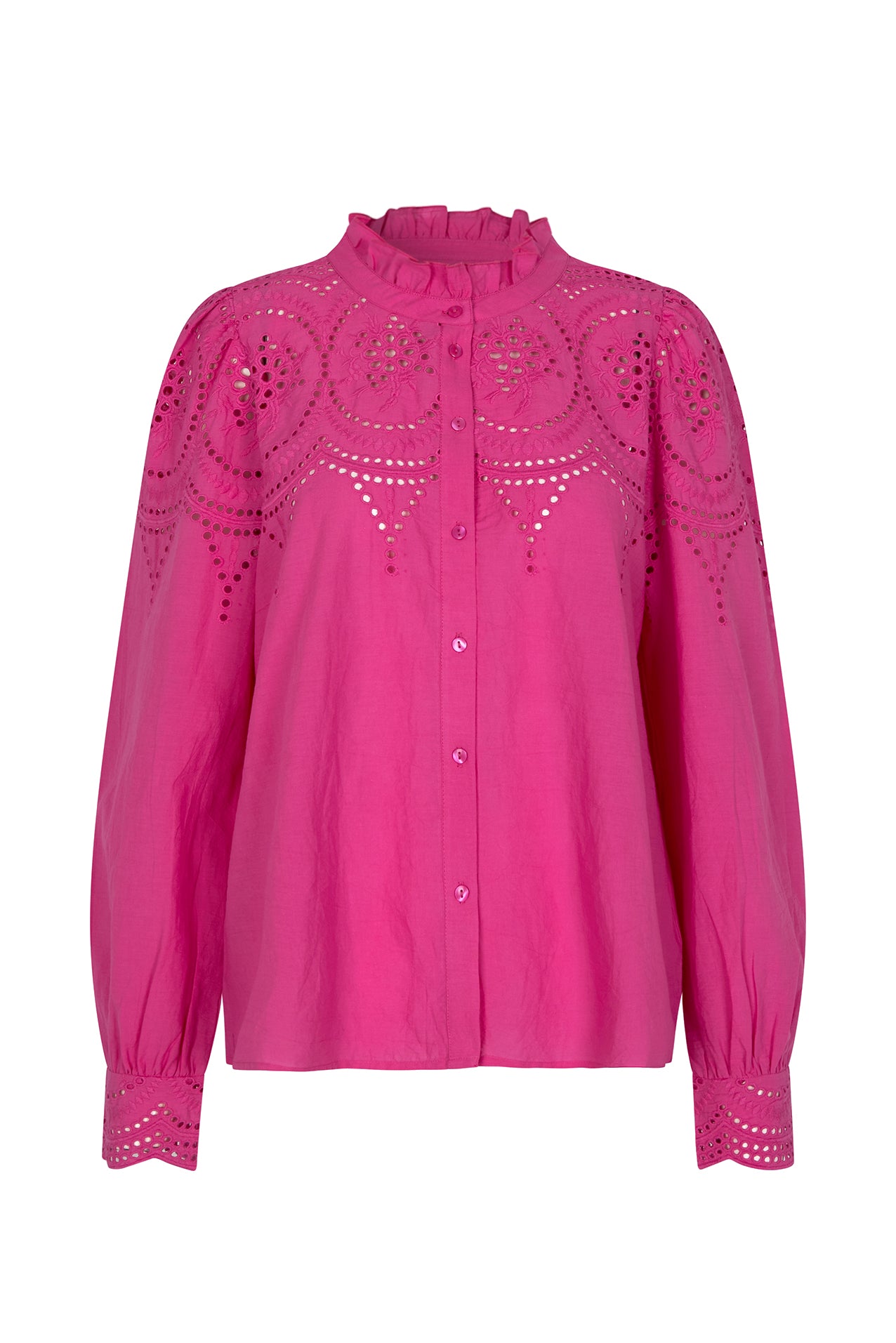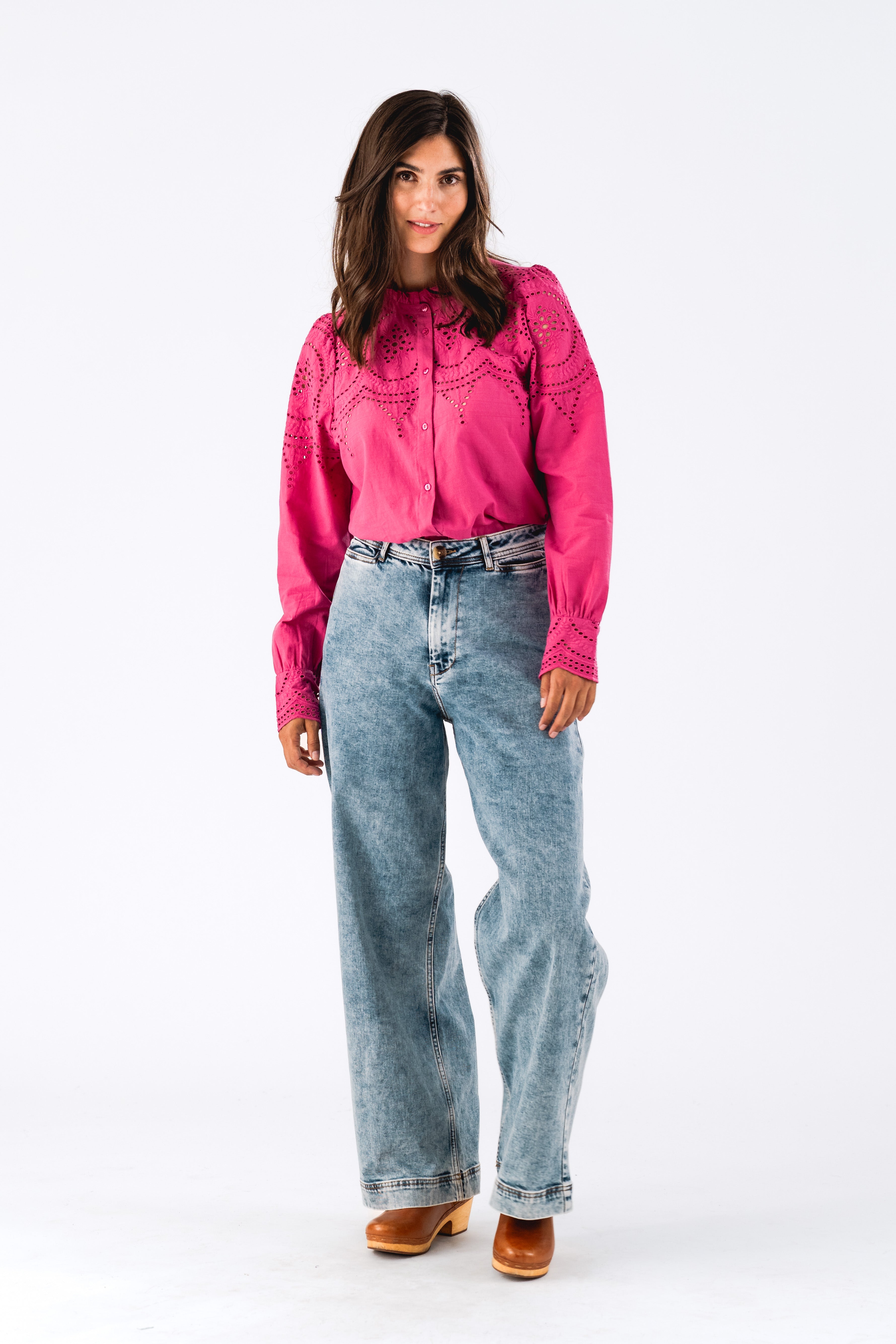 Add a bright bold pink to your daily look with the Lula shirt from Lollys Laundry. In an effortlessly feminine style, with broderie anglaise over the yoke, this blouse will elevate any outfit. Simply pair with denim jeans in an indigo wash or white colour to complete your look.