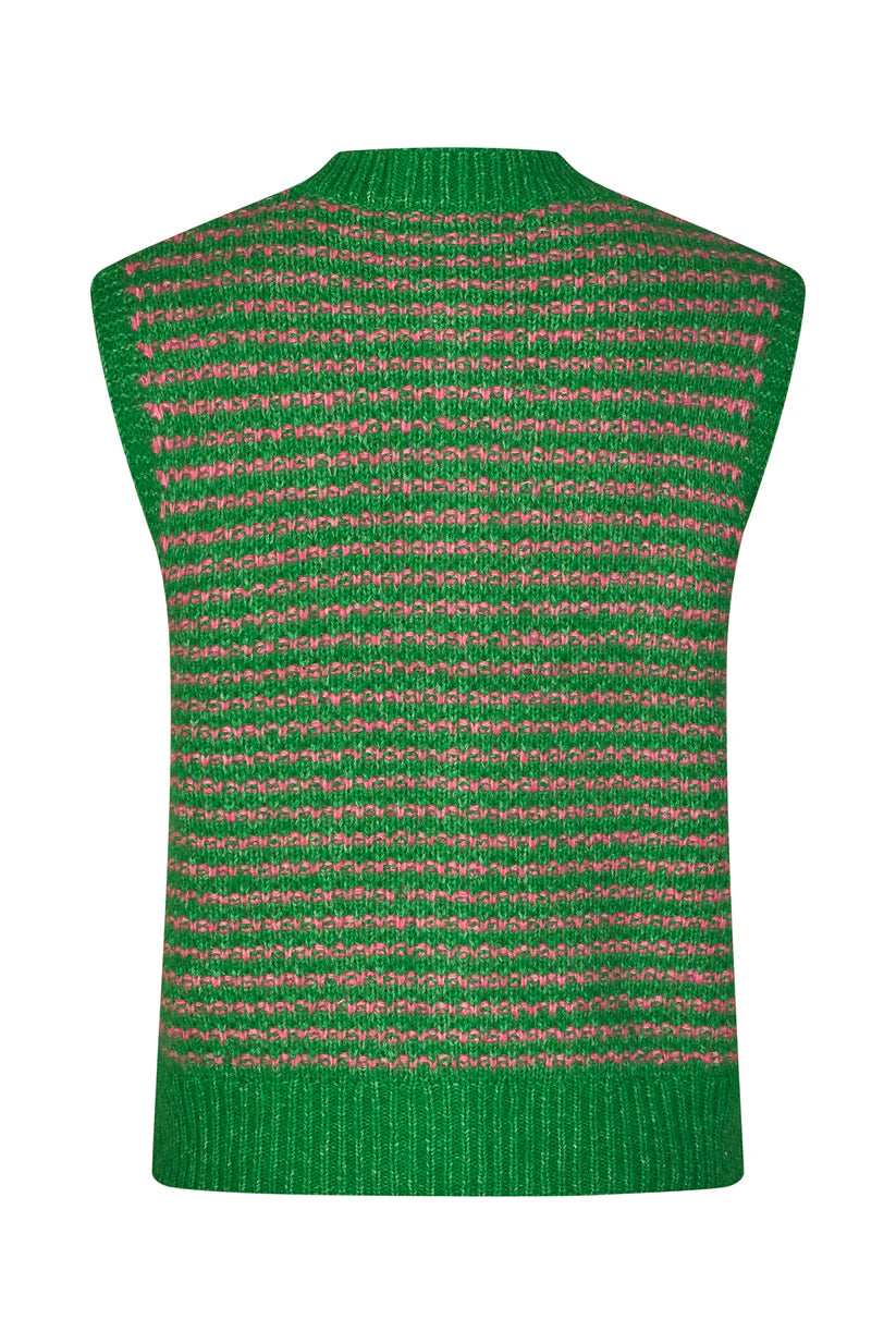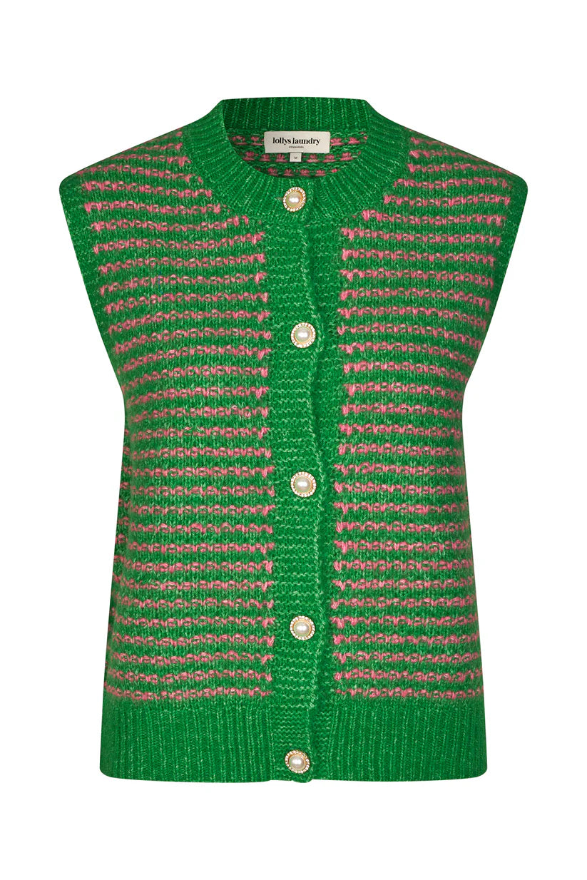 Stay on trend with this funky waistcoat-style vest. In a fun green and pink colourway, this vest can be worn on its own or layered up over a white tee or blouse. The pearly buttons add a chic look to this vest.