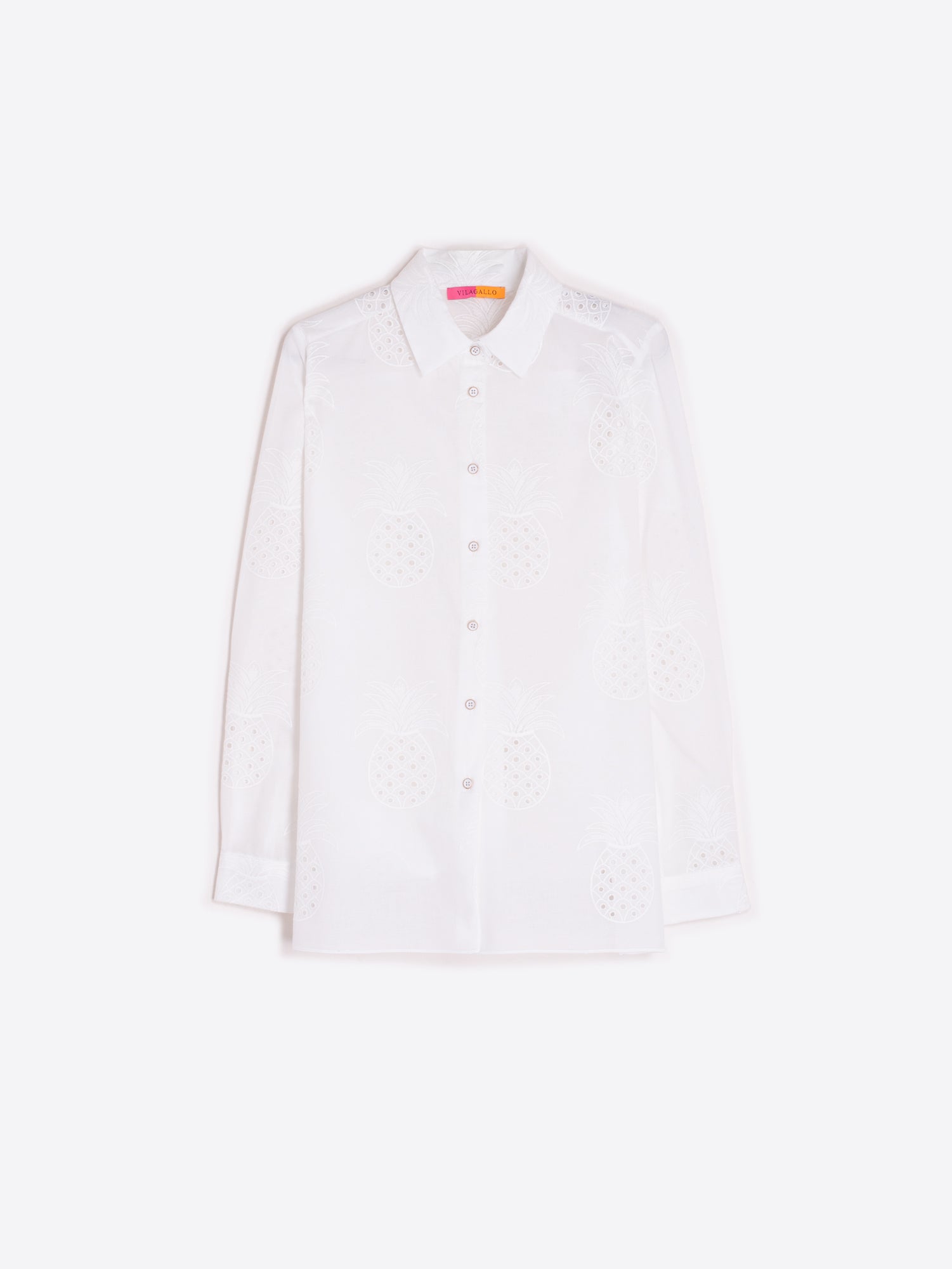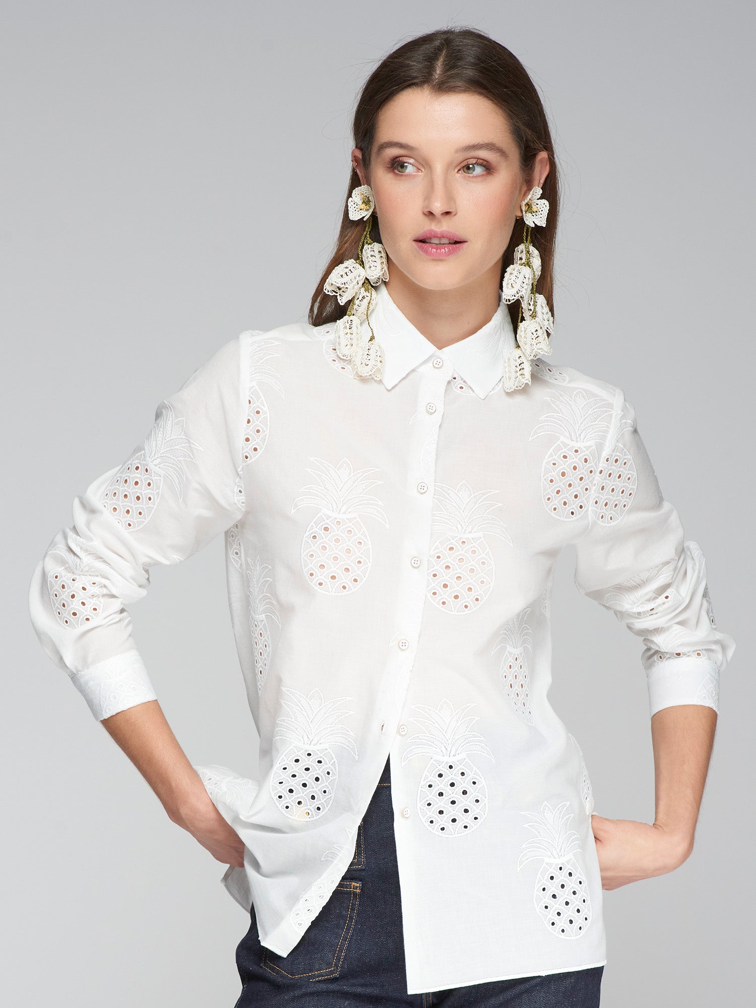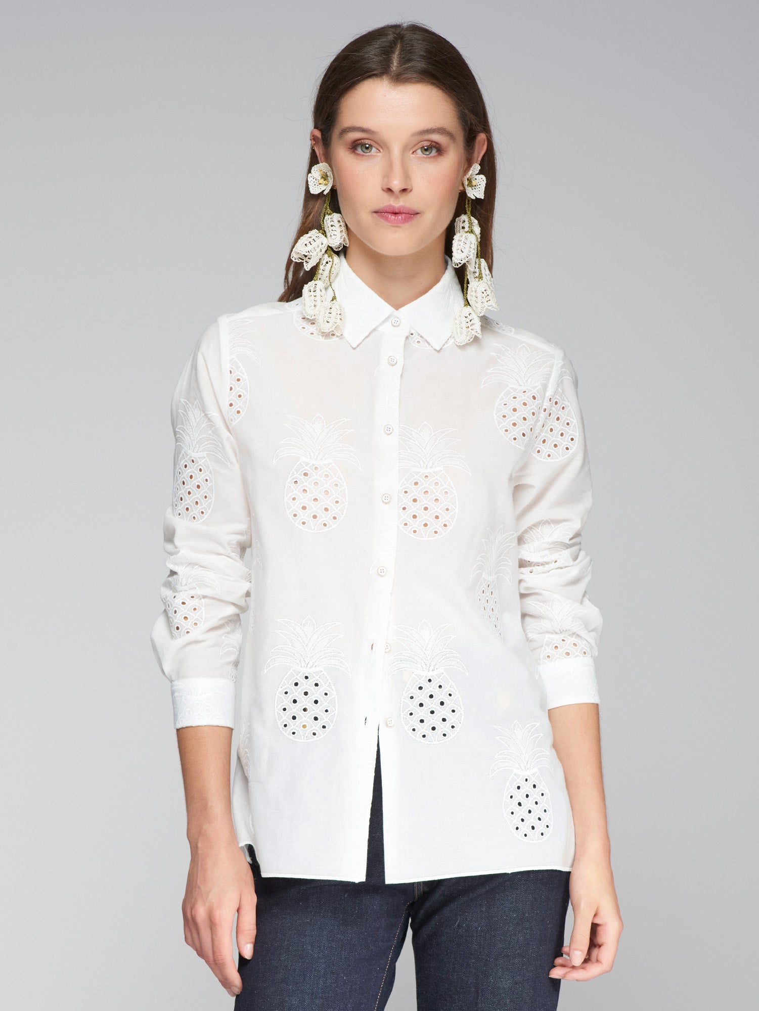 If you like pina coladas, this shirt is for you! With embroidered pineapples all over, this classic design featured a shirt collar and button up front, keeping it timeless and always in style. The long sleeves are finished with smart cuffs, so can be dressed up or down easily.
