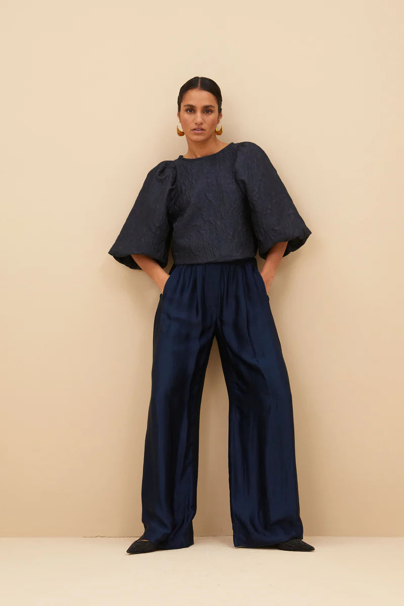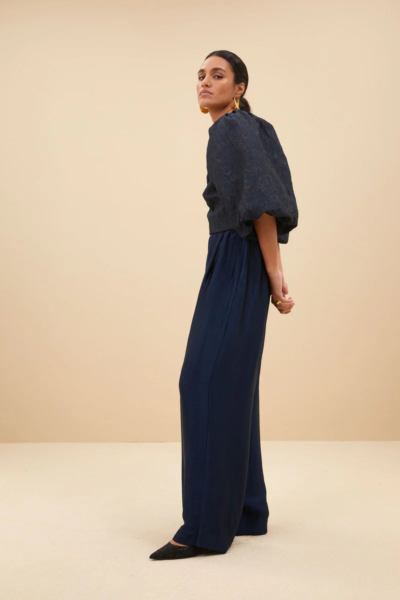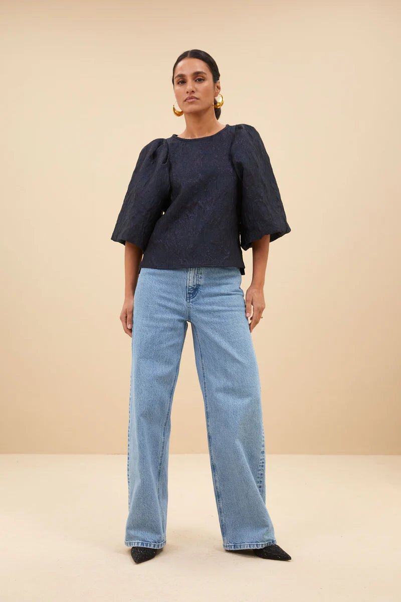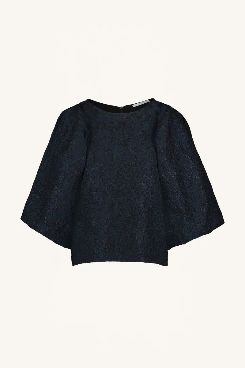 Effortlessly chic, the Zasu Jacquard Blouse in Midnight is a must-have for any fashionable wardrobe. Boasting a beautiful shape and regular fit, this blouse is elevated by its round neckline, puffed sleeves, and playful style. Complete with a convenient zipper closure, it's the perfect blend of style and functionality.