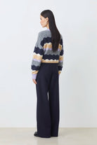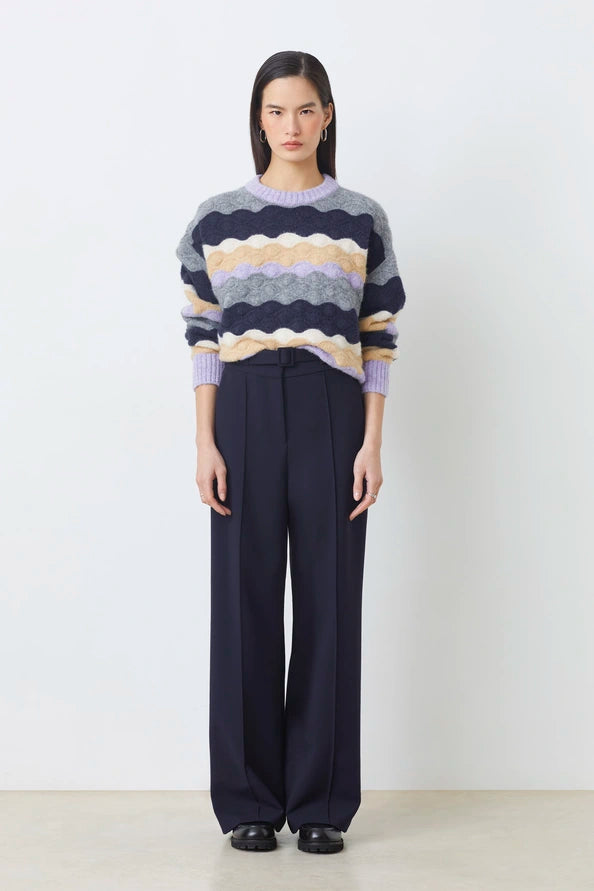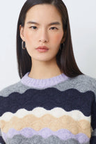 A casual throw on jumper like this may look put together, but is truly effortless. Easy to layer over a white shirt or light layer, this jumper is casual but full of personality thanks to it's scalloped stripe. The colour combination of purple, navy, grey and butter yellow keeps this simple piece unique, we promise you'll get endless compliments.