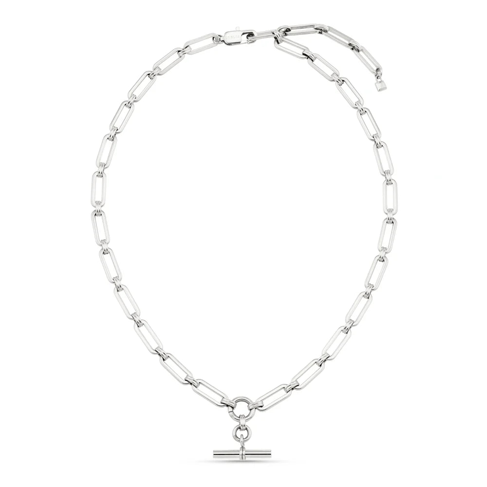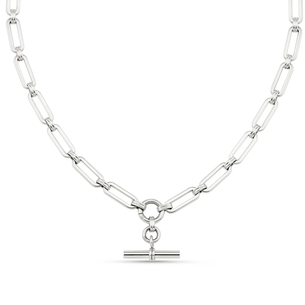 A piece like this can be worn on any day and for any event. With a lineal link chain and a trendy t-bar charm, this necklace is a statement without the effort. You can easily wear this necklace alone, or stack it with other chains to create the ultimate finish to an outfit.