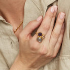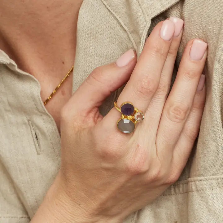 Our best selling ring from Ashiana is back. Featuring three semi-precious stones, this ring brings elegant style to any look, and the yellow toned gold band keeps this truly timeless. We think that this ring makes for the most perfect gift thanks to its adjustable band, who wouldn't love this!