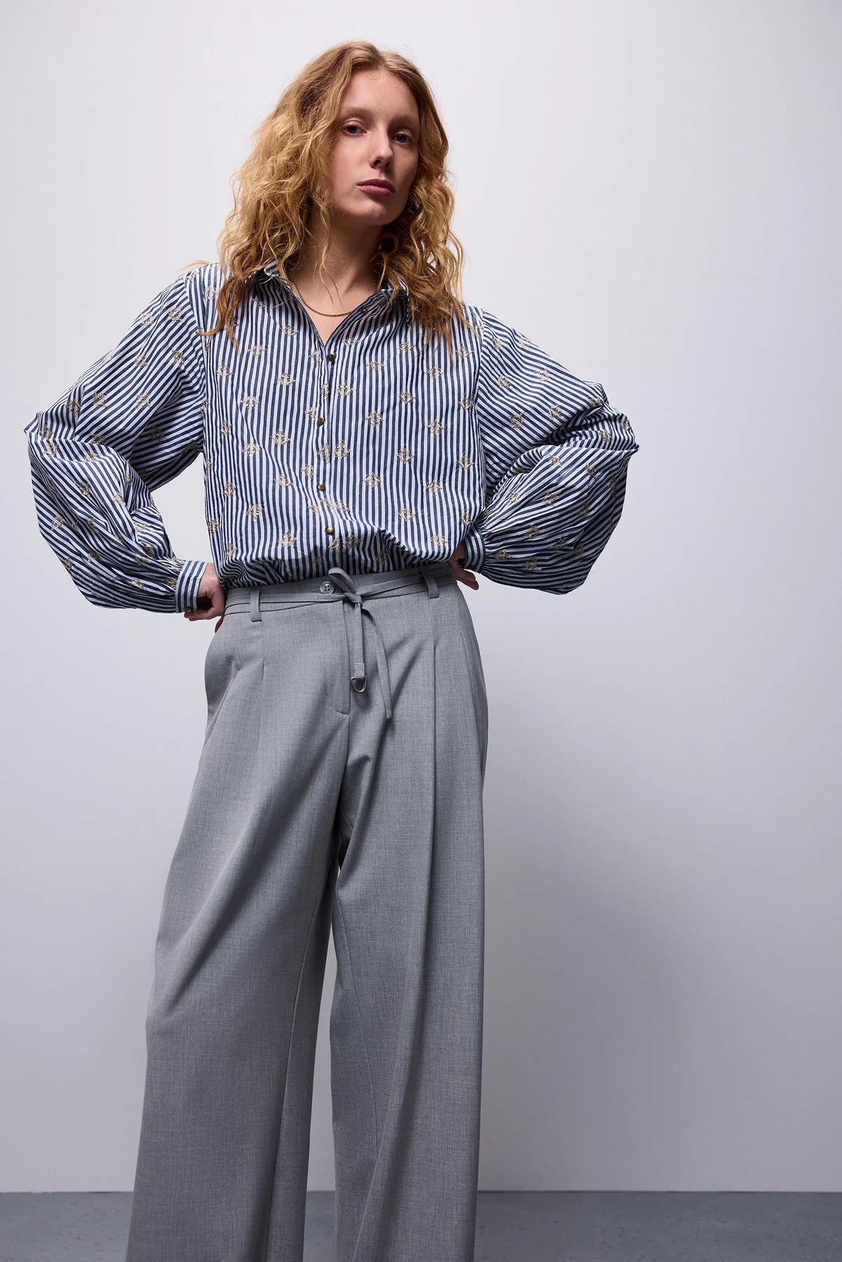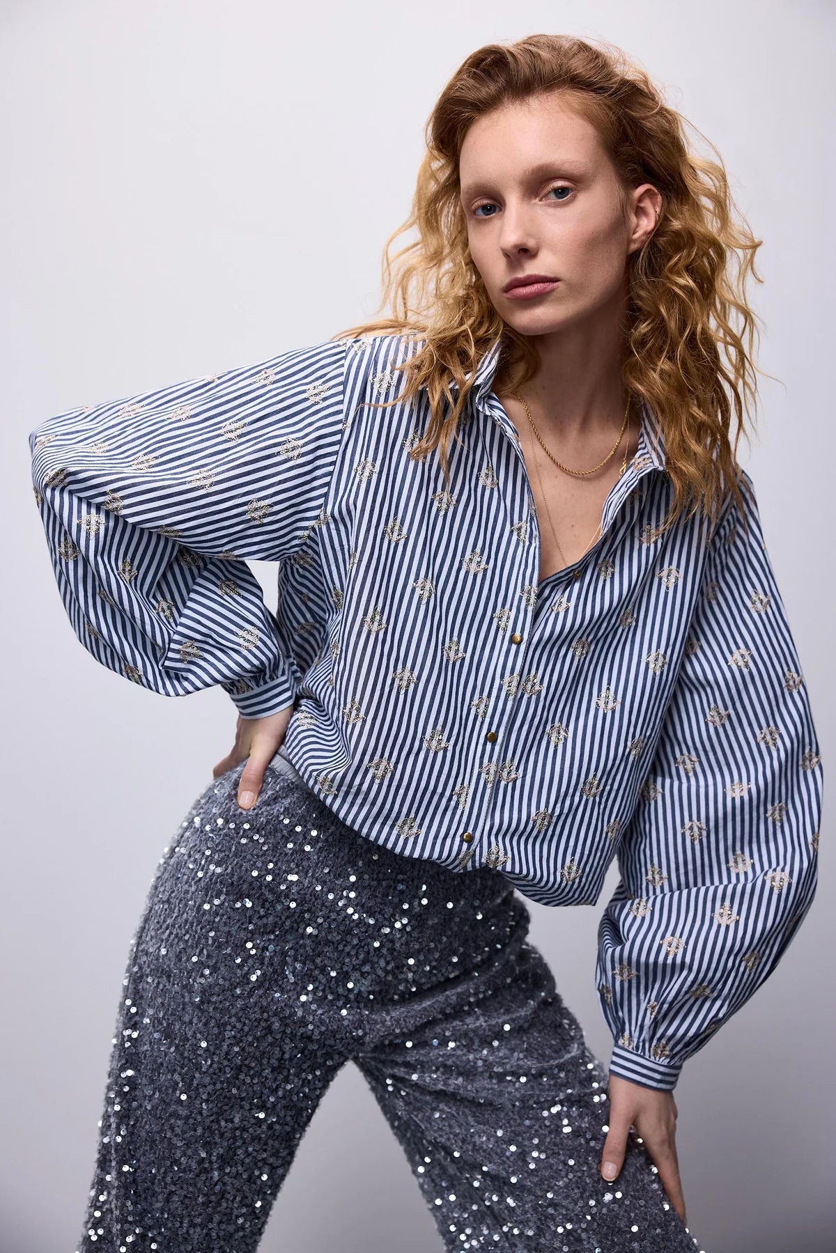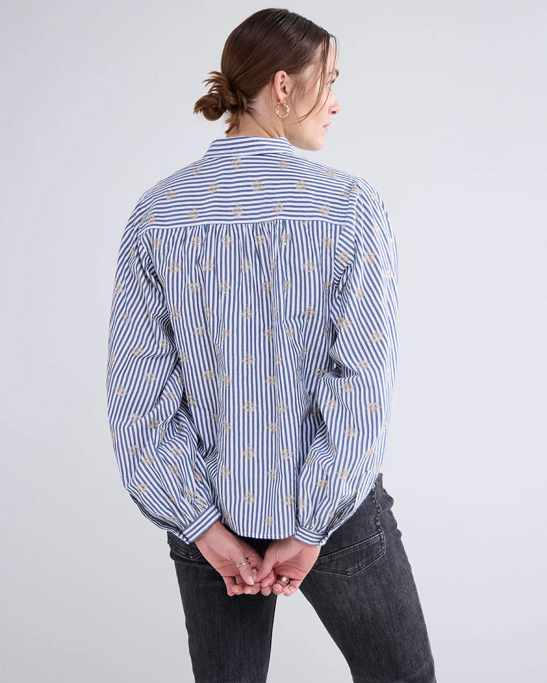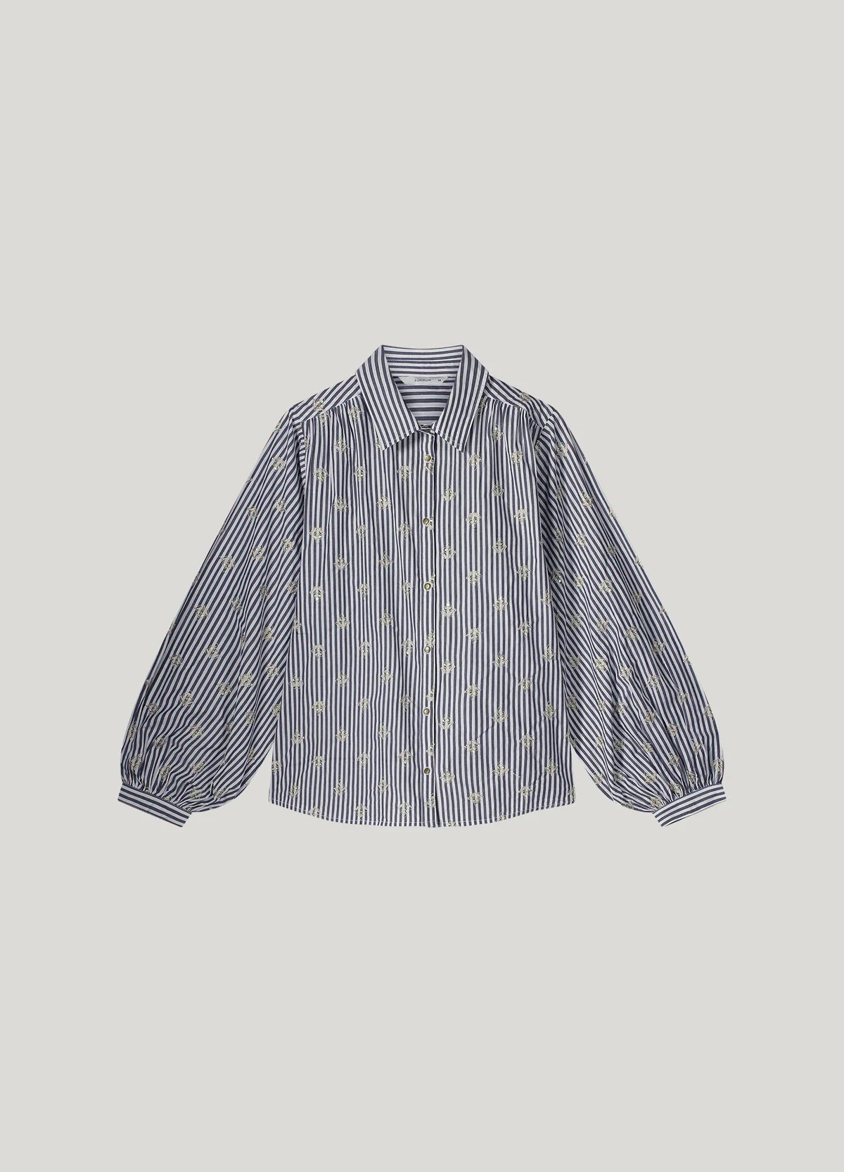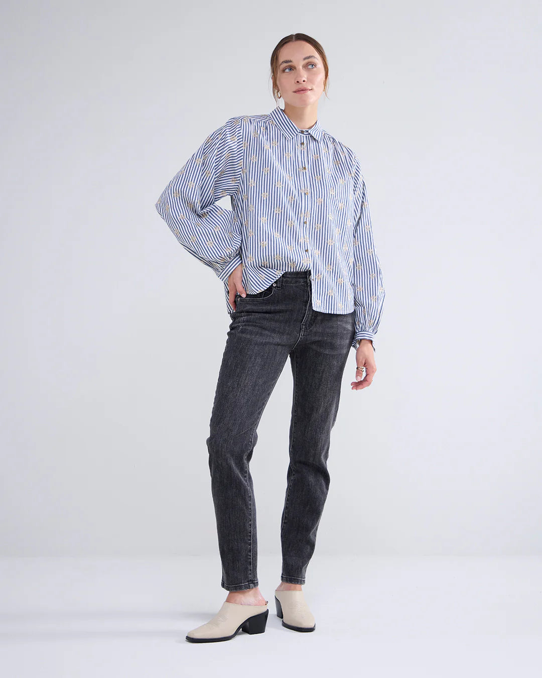 This embroidered shirt is a fresh twist on your classic tailored blouse. With a striped design and all over embroidered style, this shirt also features a classic lapel collar for smarter wear. The subtle puffed sleeves and shorter length make this a perfect piece for pairing with wide leg jeans.