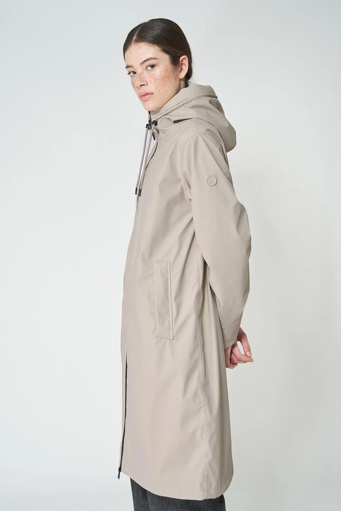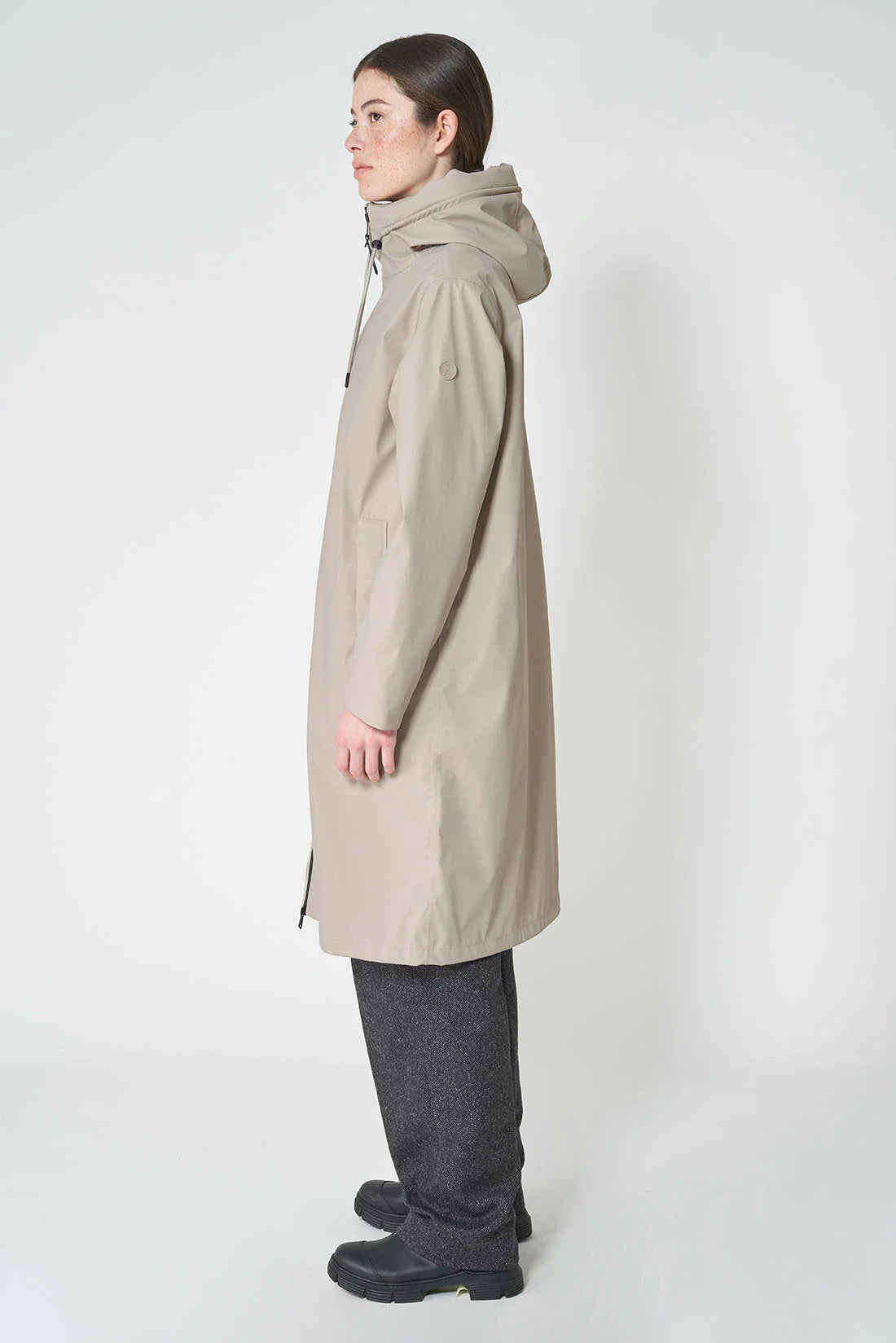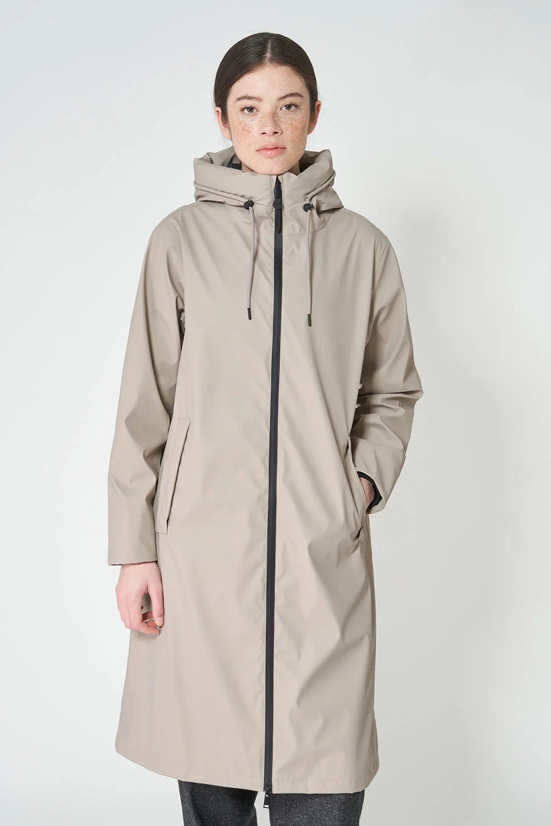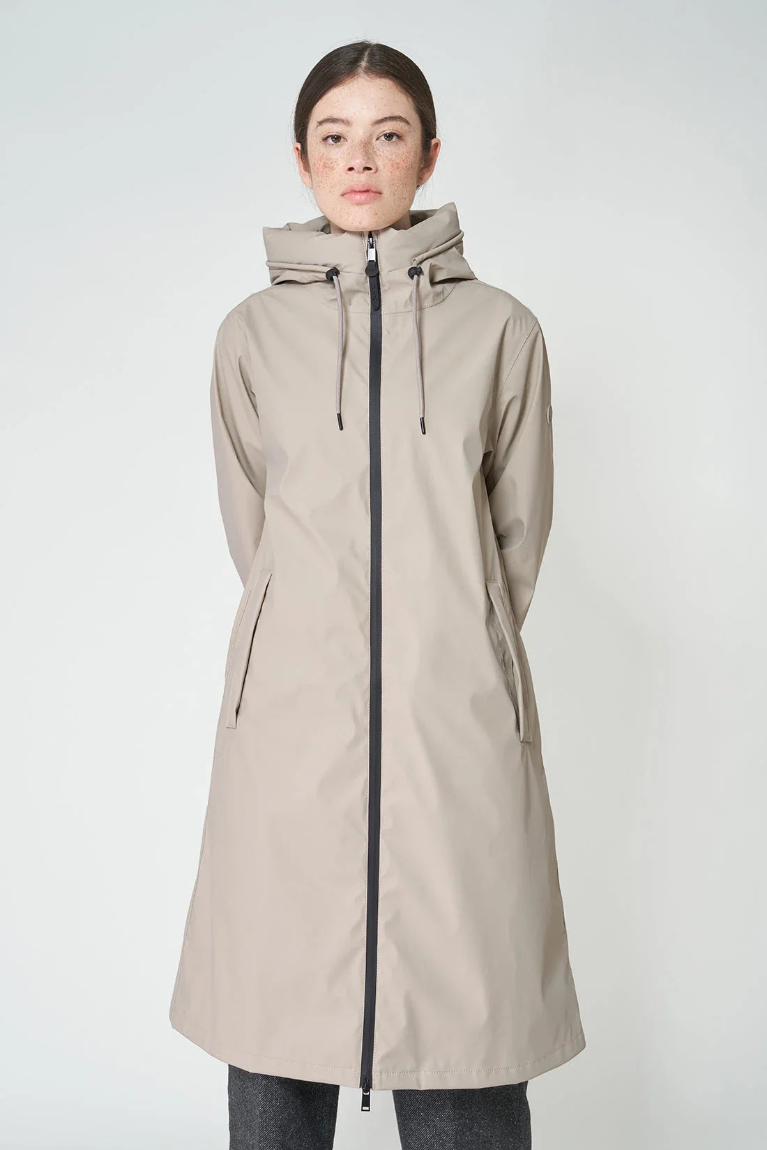 This practical and minimal coat boasts a simple a-line silhouette and is made with 100% waterproof matte PU. With functional elements like a double slider zip and structured hood for extra protection, this beautiful coat will be a timeless addition to your wardrobe.