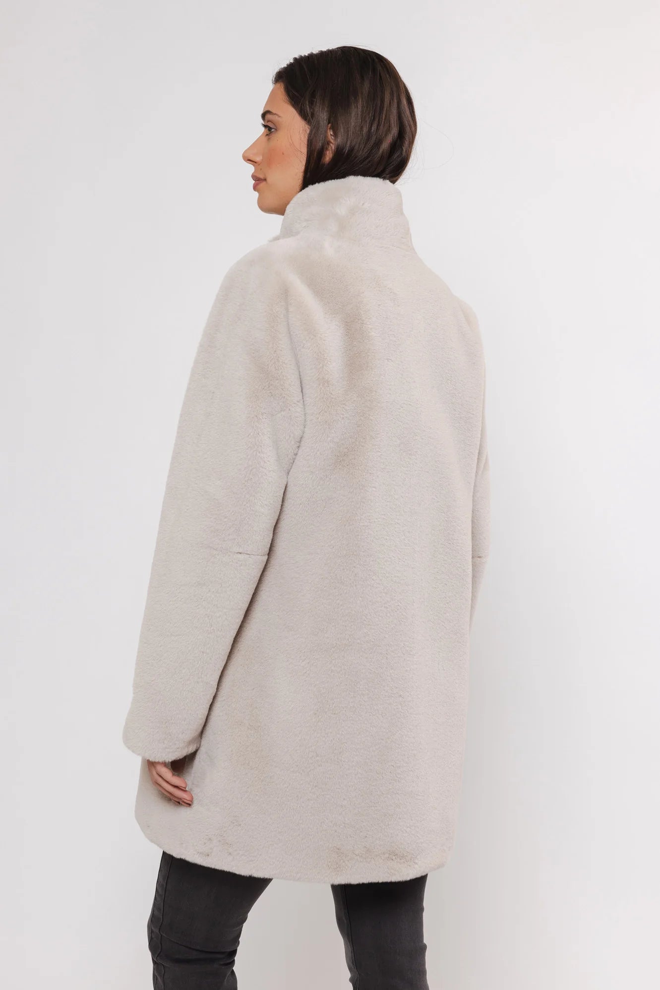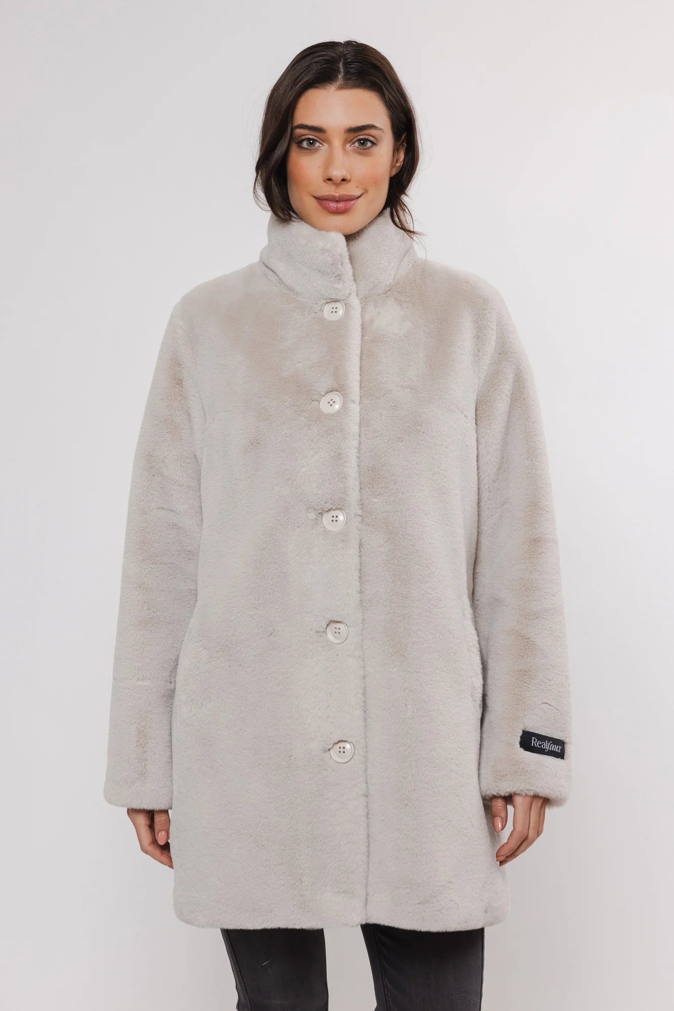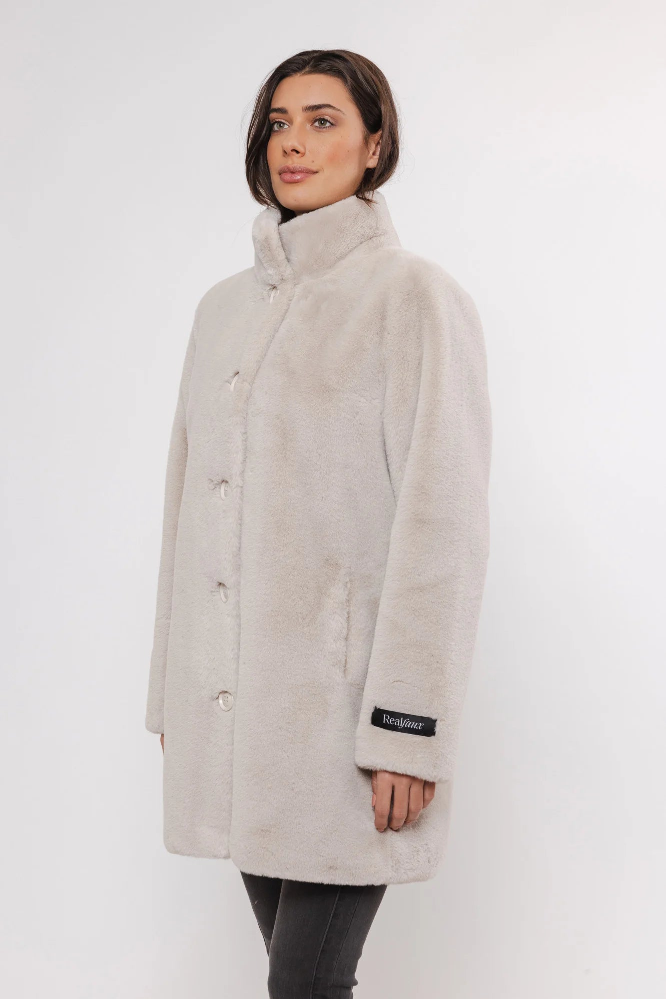 Stay warm and fashionable with our Nonna Faux Fur Coat. Its medium length, high neck collar, and hidden pockets provide practicality, while the button-up fastening and luxurious material add a stylish touch. Snuggle up in this warm and trendy coat all winter long.